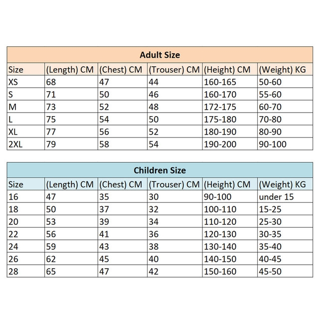 Storleksguide vuxen (längd, bröst, byxor, höjd)