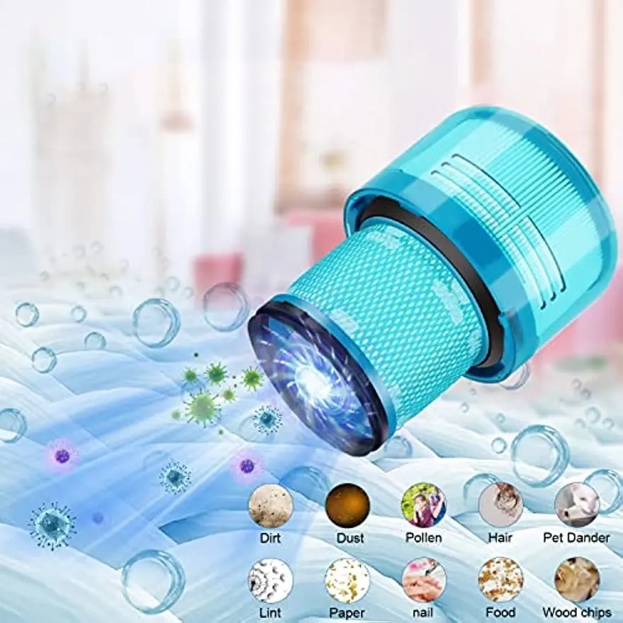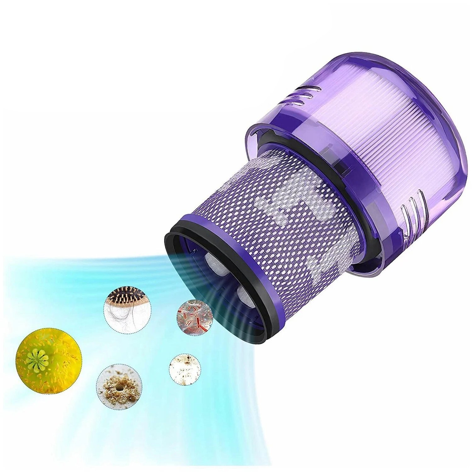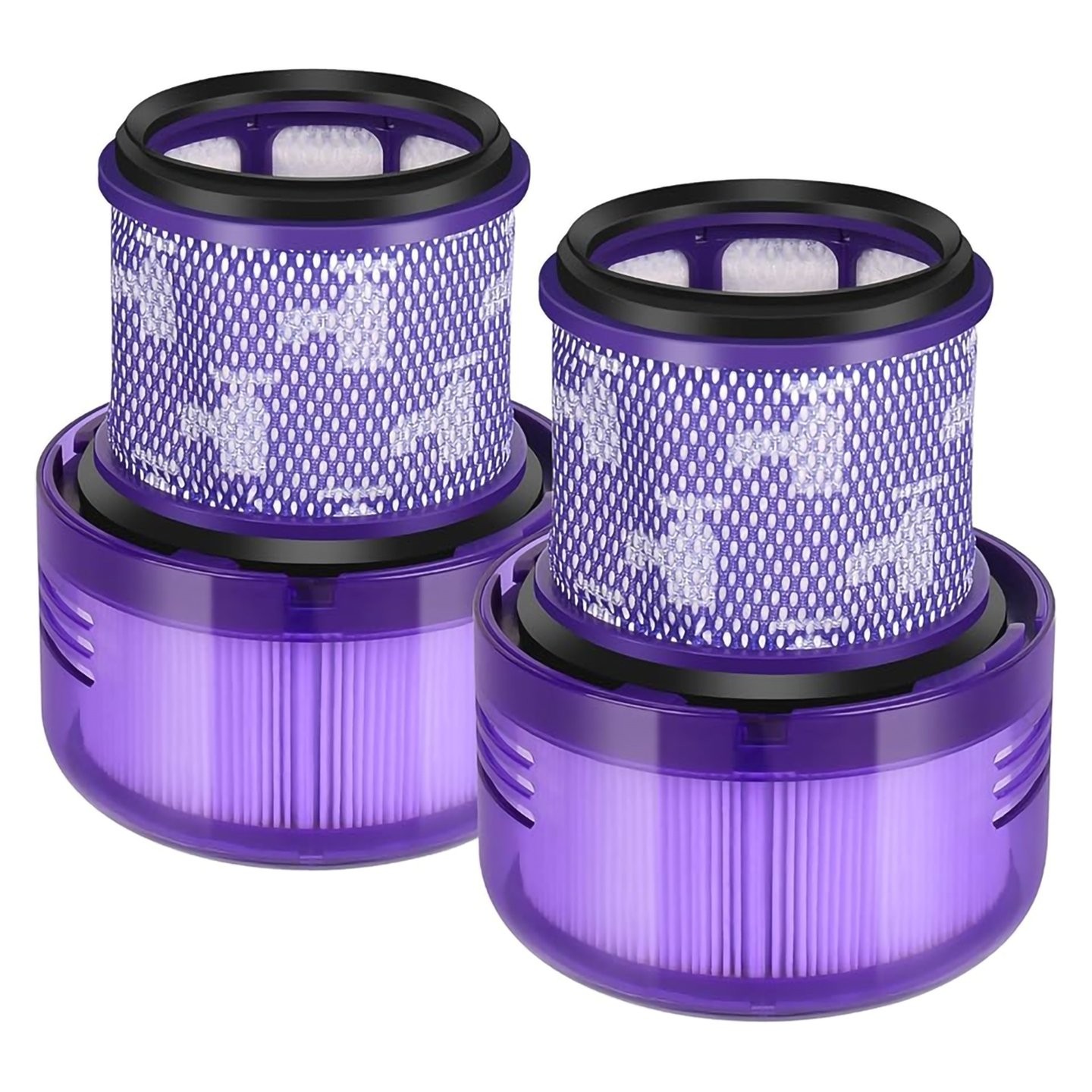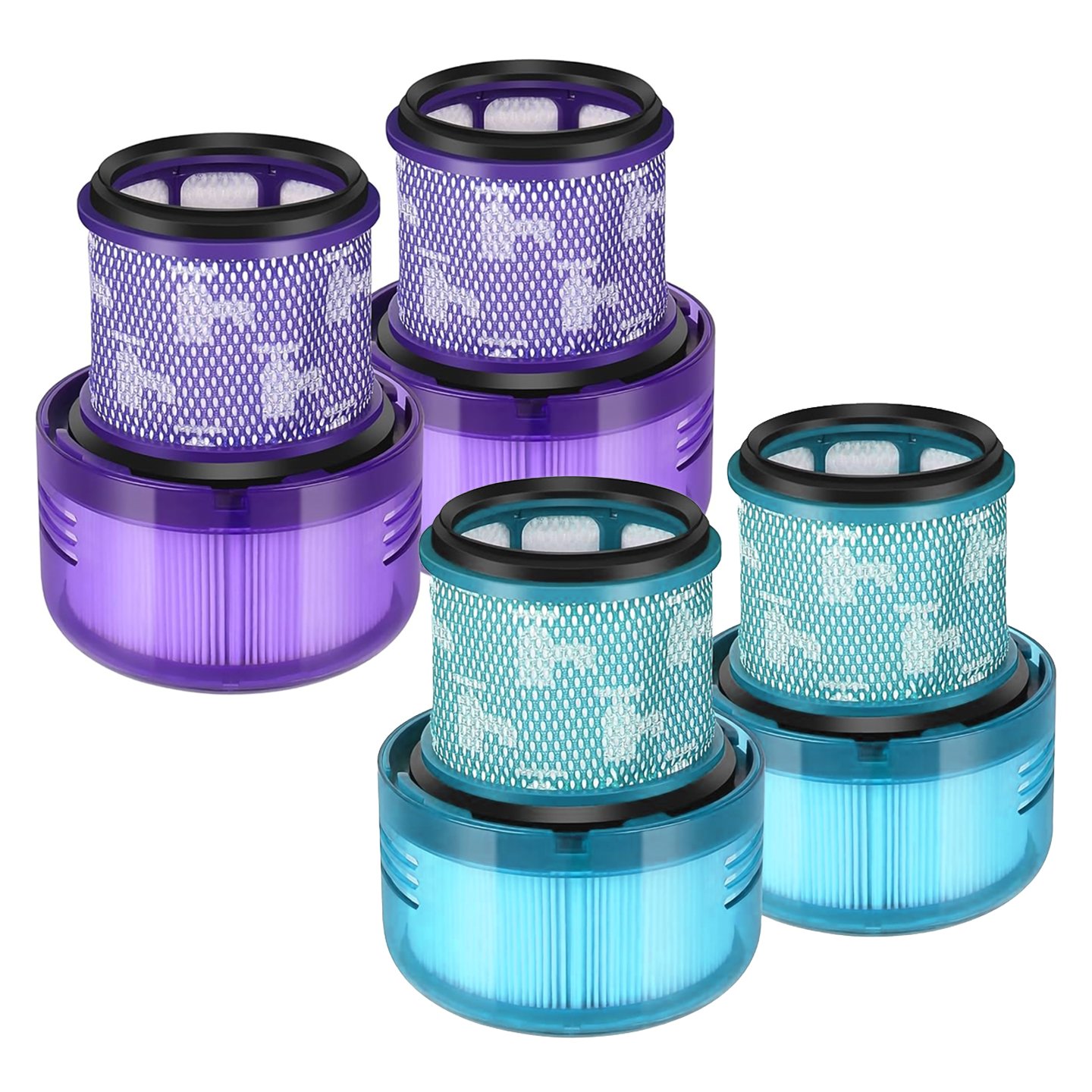 Tvättbara HEPA filter i blått och lila för Dyson V11 och V15. Effektiv filtrering för allergiker och husdjur.