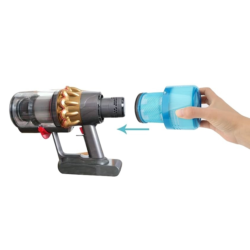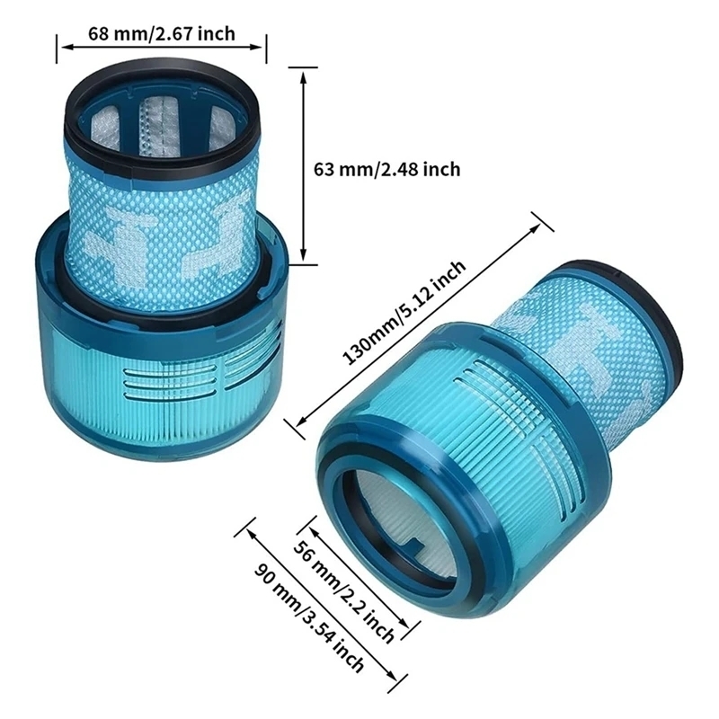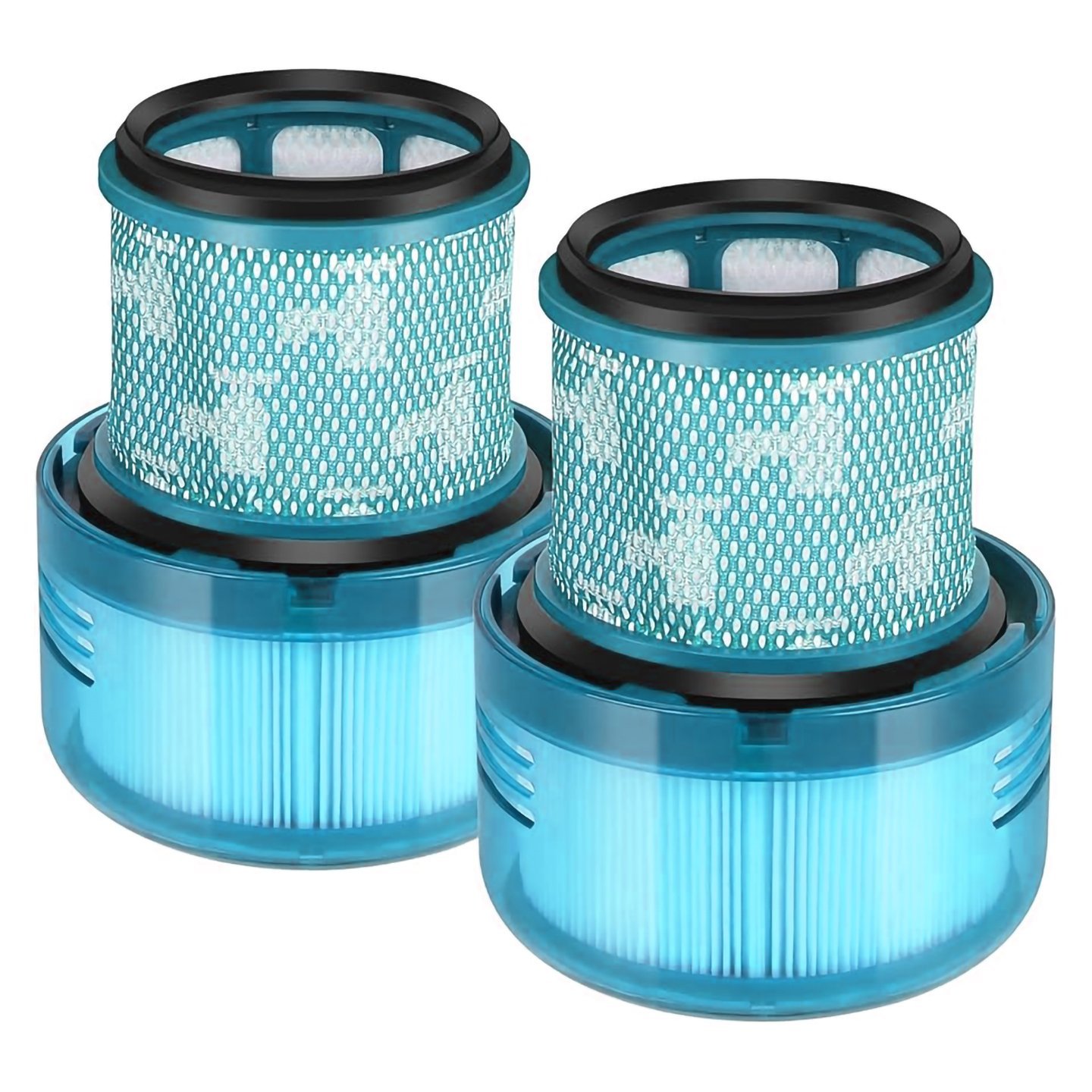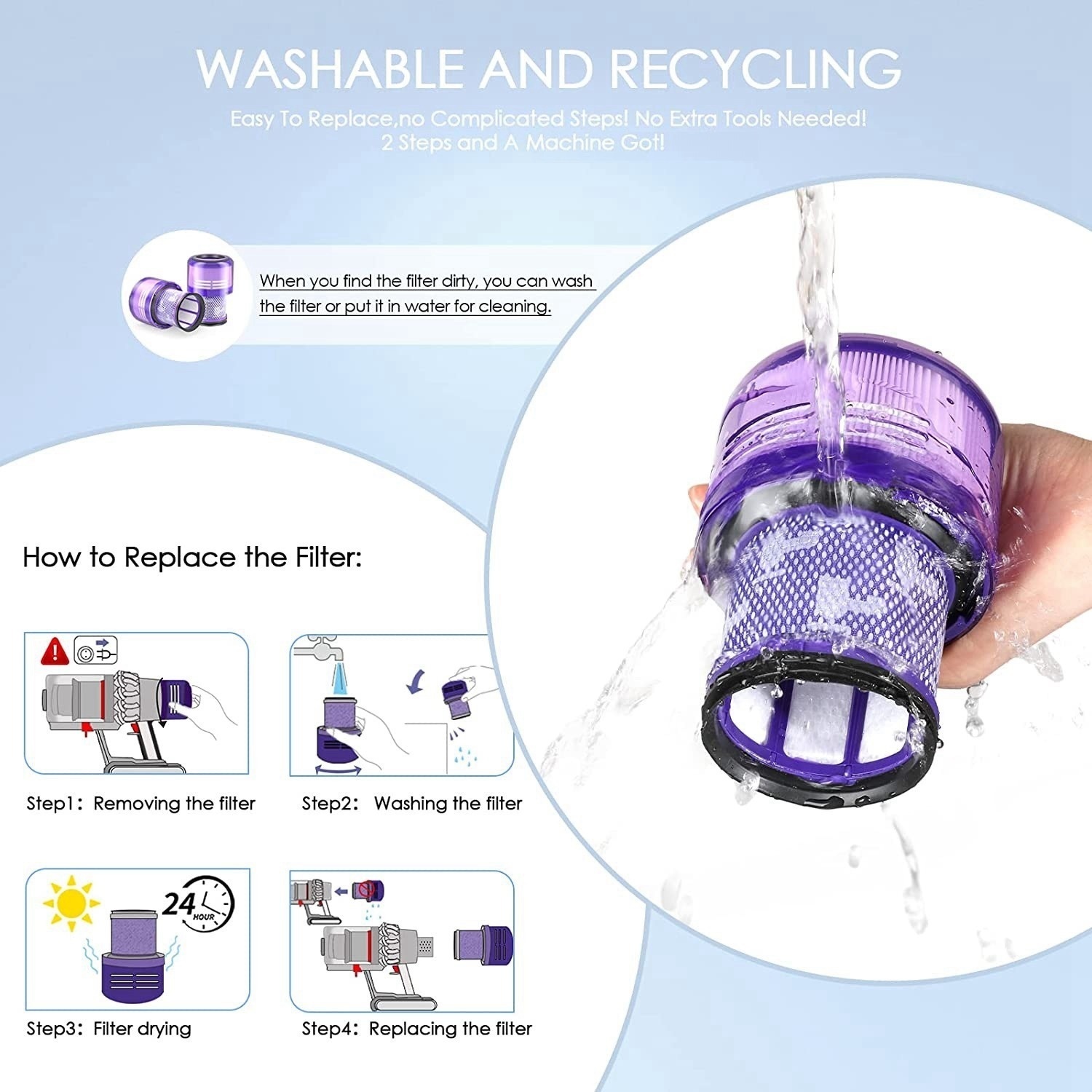 Tvättbara HEPA filter i blått och lila för Dyson V11 och V15. Effektiv filtrering för allergiker och husdjur.