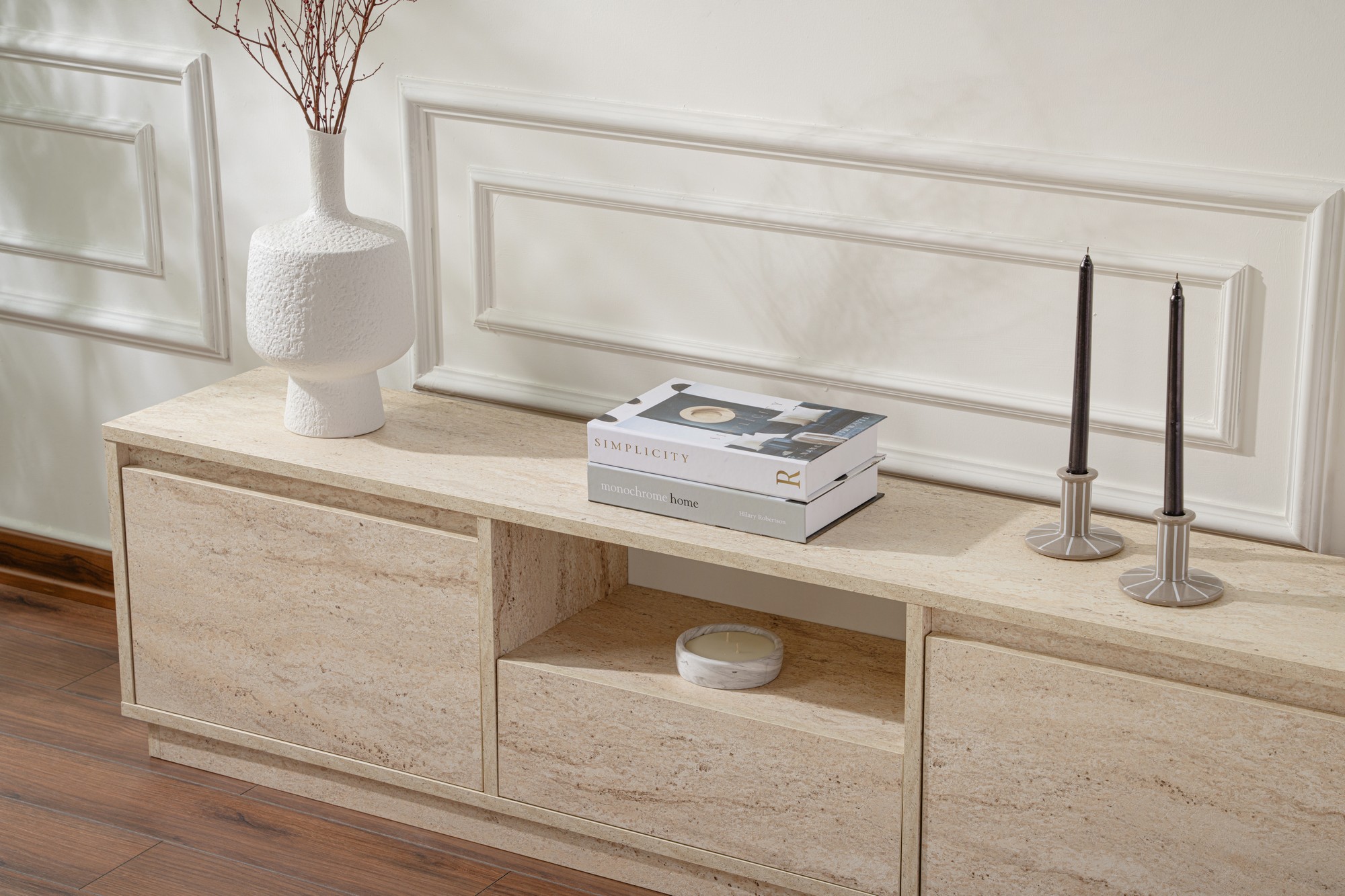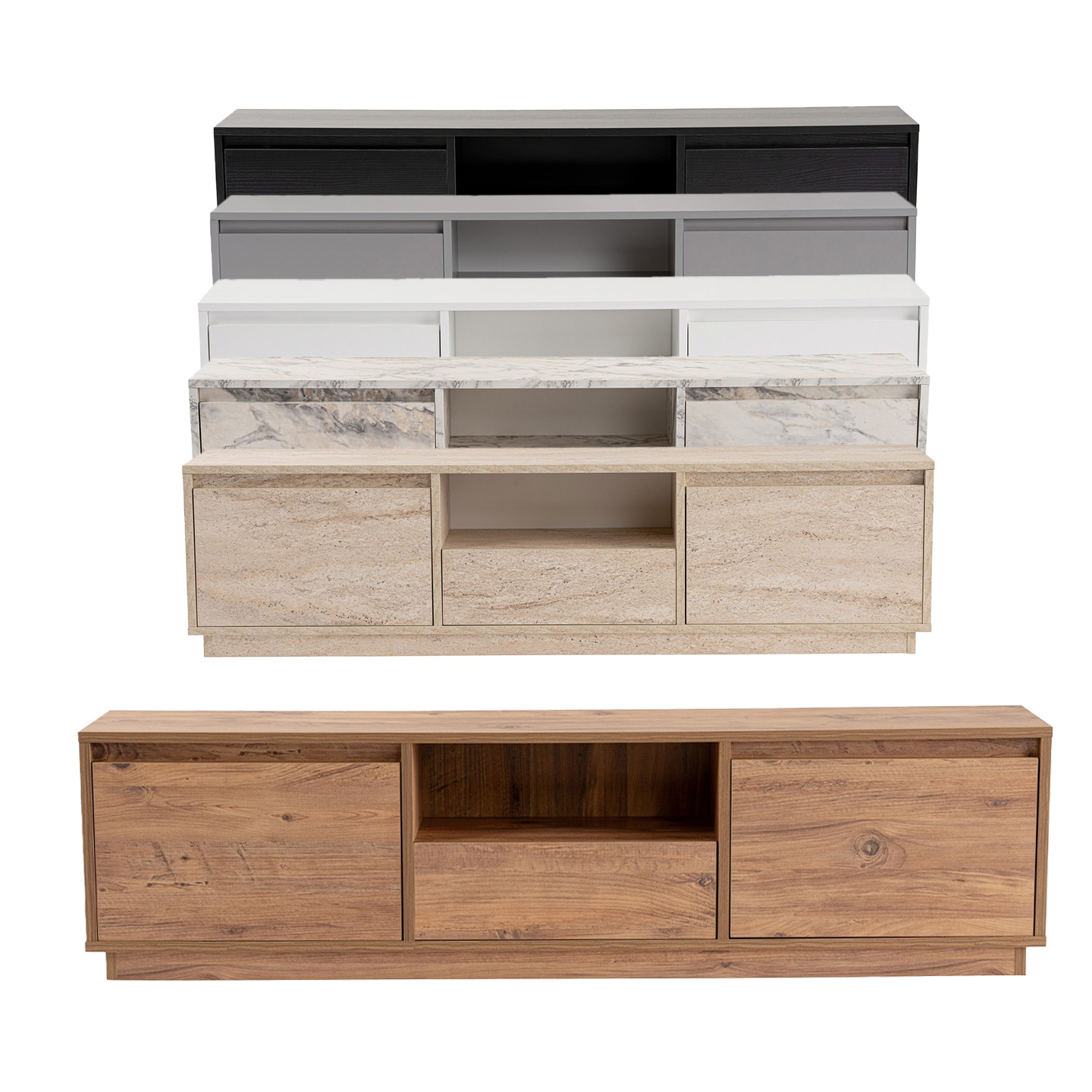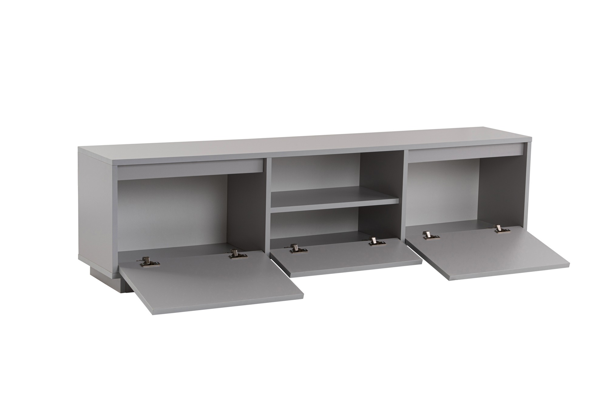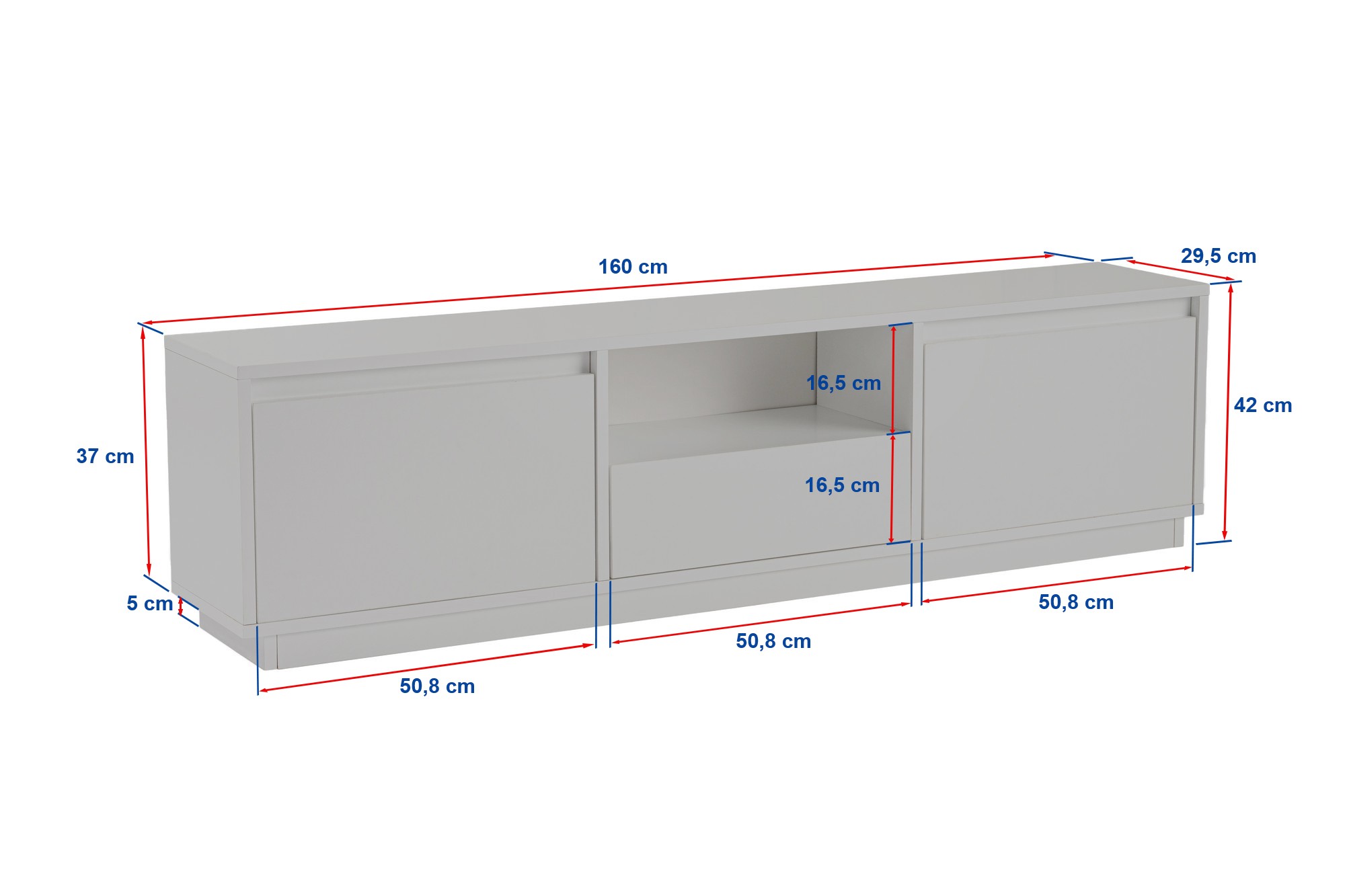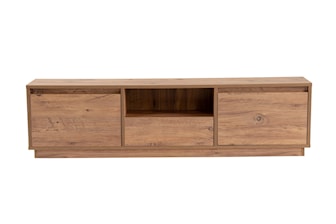 En stilren och praktisk TV-bänk på 160 cm. Två skåp och en öppen hylla gör det enkelt att hålla ordning på fjärrkontroller, spelkonsoler och andra tillbehör. Tillverkad av tålig, melaminbelagd spånskiva som är lätt att rengöra. Finns i flera färger så att du kan hitta den som passar ditt hem bäst.
