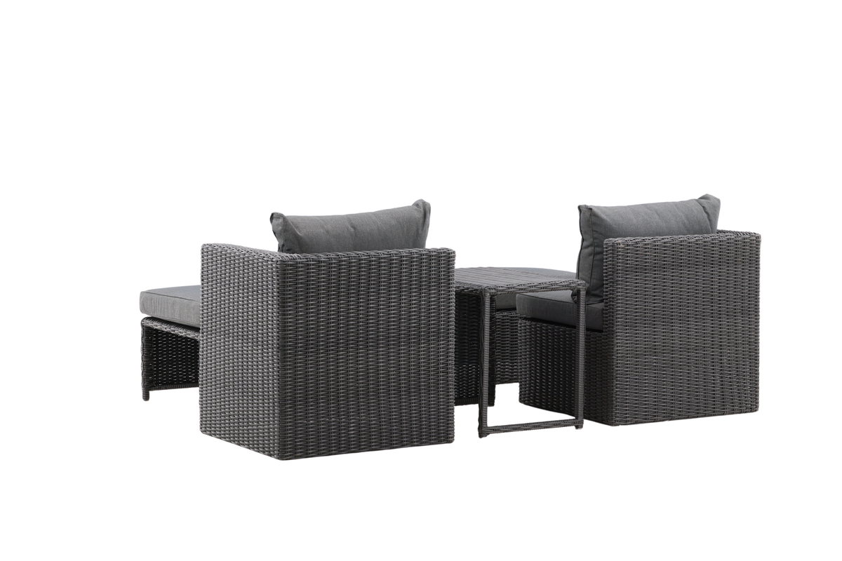 Skapa en mysig lounge-hörna med detta set av två fåtöljer med fotpallar och dynor och ett mindre bord. Allt tillverkat i slitstarkt konstrotting.