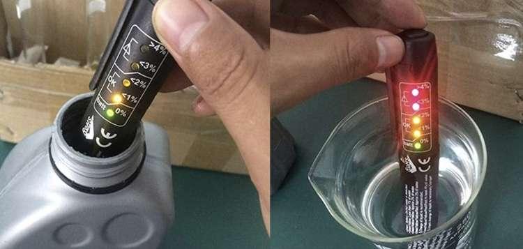 Testaren har lysdioder som indikerar nivån på det flytande vattnet.