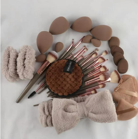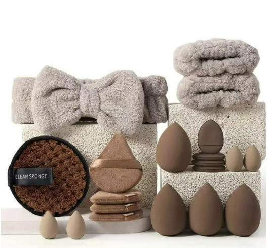 - Innehåller makeupborstar, beauty sponges, finger puffs, kuddar, bomullspuffar, rengöringspads, rengöringsverktyg och hårband