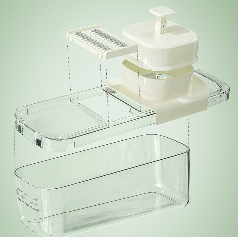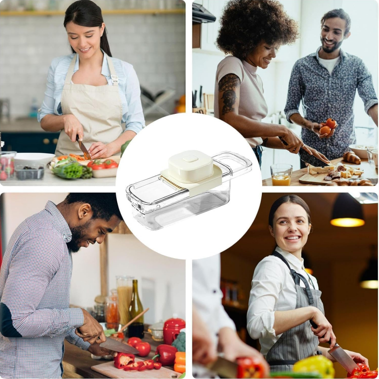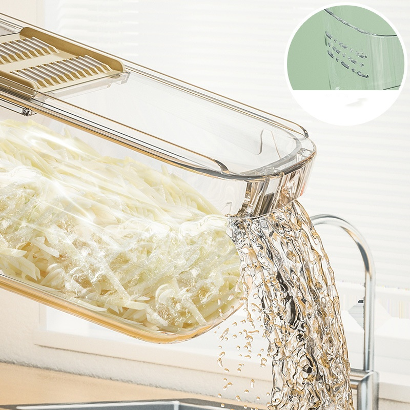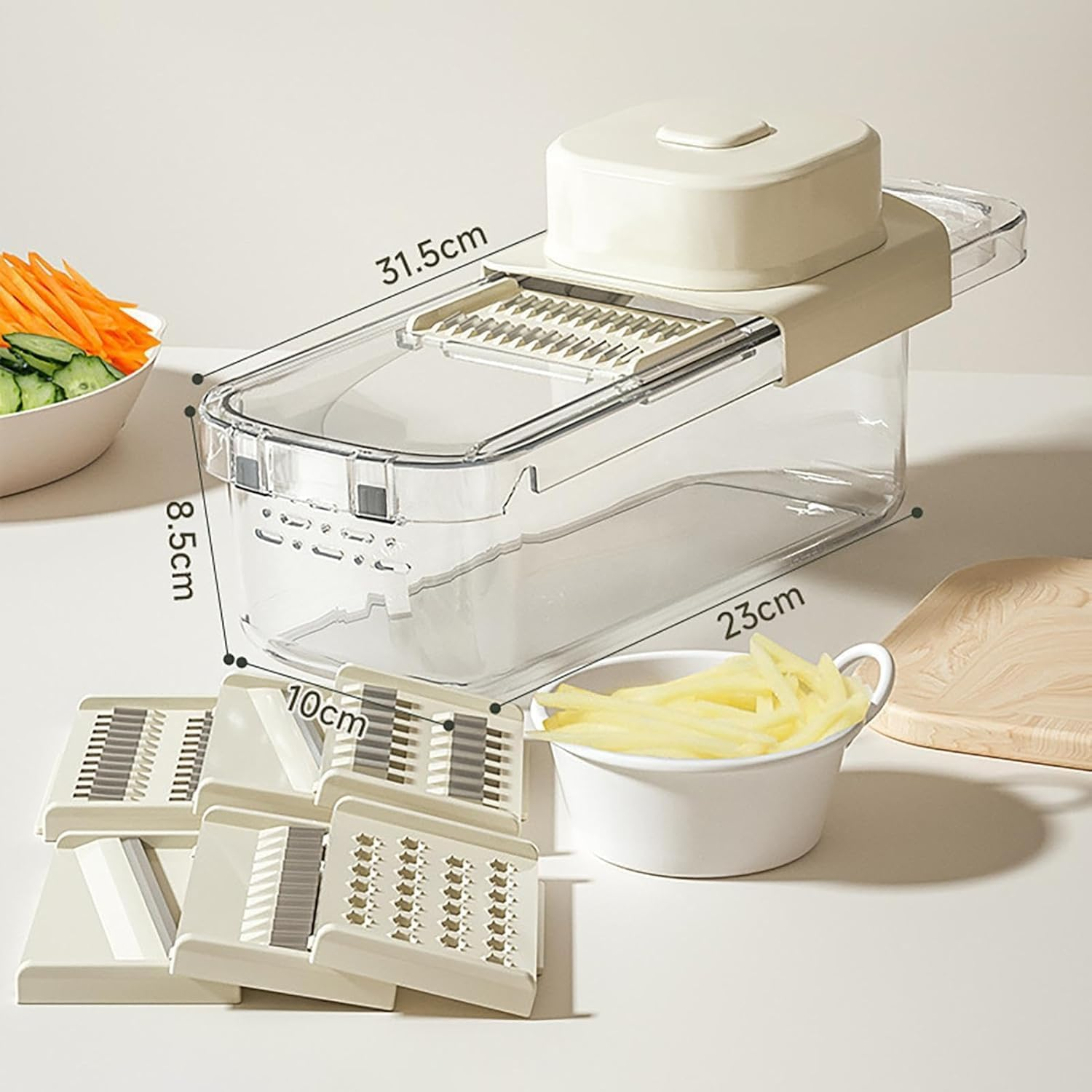 Gör matlagningen enkel och tidseffektiv med denna multifunktionella grönsakshackare. Mandolinen levereras med sex utbytbara blad som gör att du kan tärna, strimla, skiva och rutskära i olika storlekar. Perfekt för ost, grönsaker, potatis, lök och mycket mer. Den medföljande silskålen gör det även smidigt att skölja grönsakerna och äggseparatorn låter dig snabbt skilja äggvita från äggula.