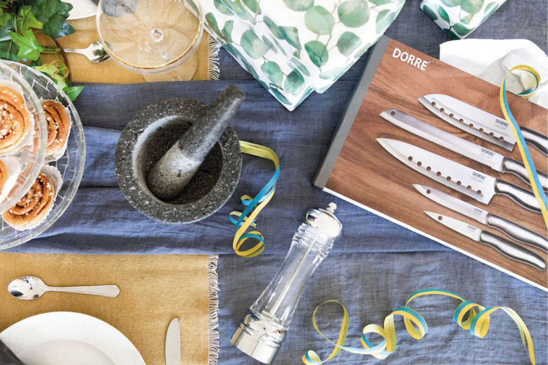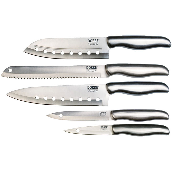 Det perfekta set knivar att ha hemma. Du får en japansk kniv, en kockkniv, en brödkniv, en allkniv och en skalkniv.