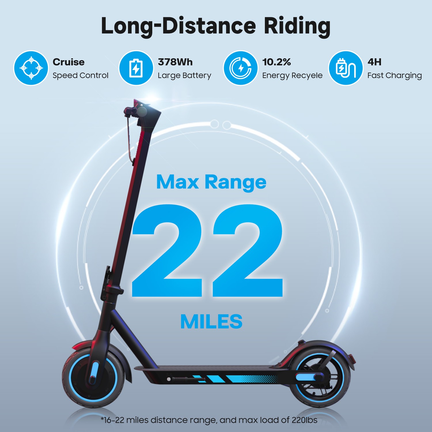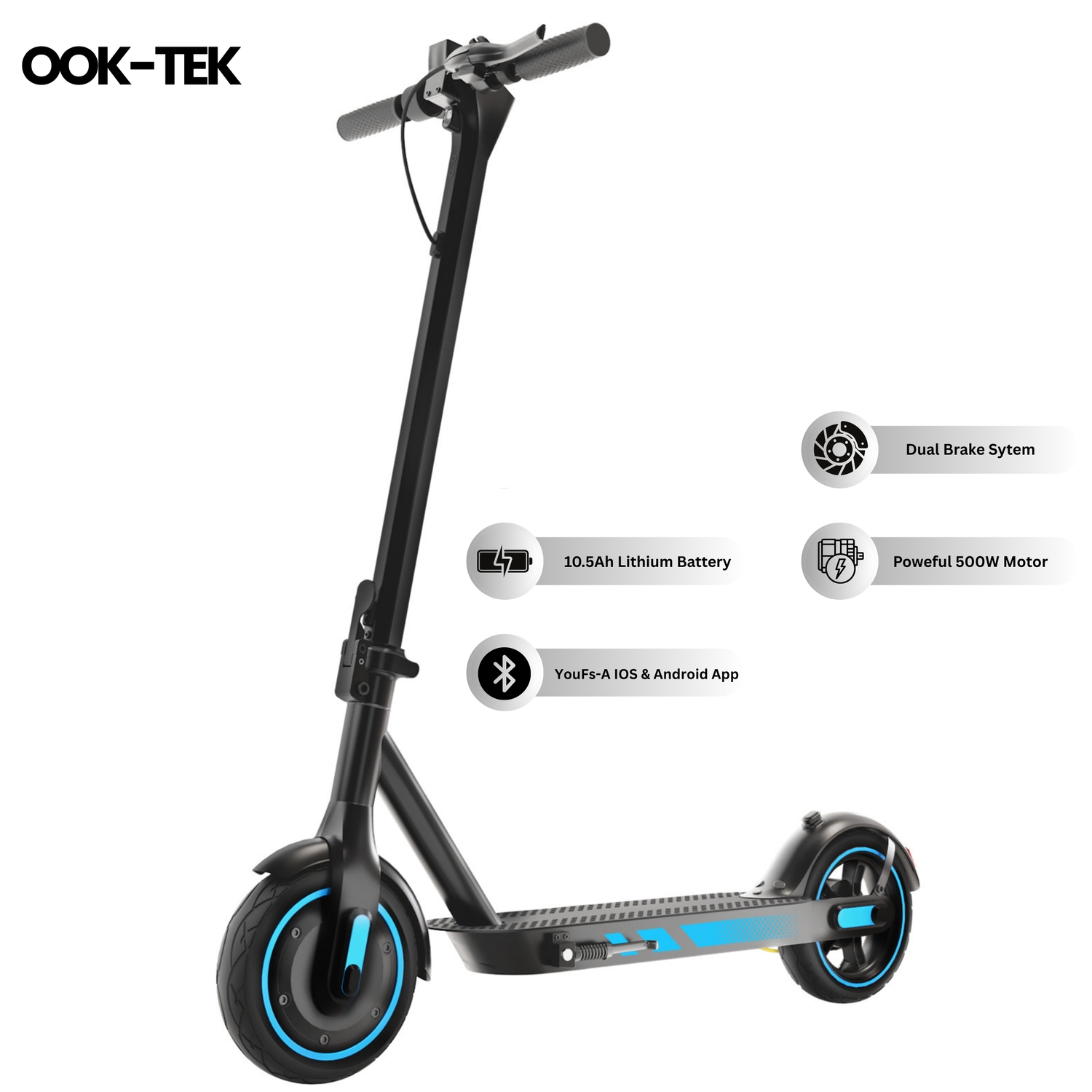 Scootern är utrustad med luftfyllda 10-tumshjul både fram och bak, vilket ger en stabil och bekväm körupplevelse även på ojämnt underlag. Den har både fram- och bakljus, bromsljus.