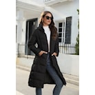 Vadderad lång jacka för kvinnor med huva. Håll dig varm med stil i vinter med denna vinterjacka. Välj mellan svart, ljusbeige och röd.