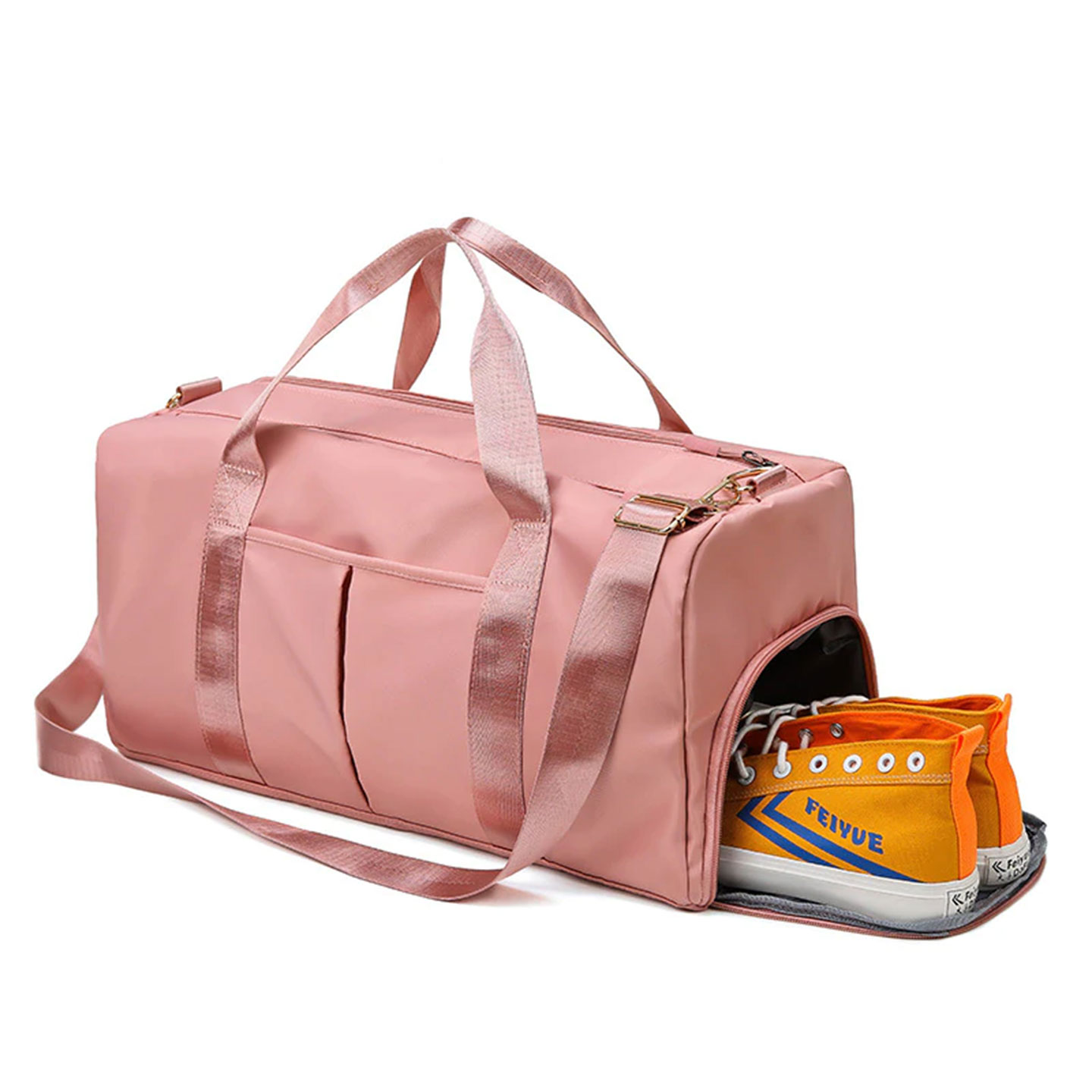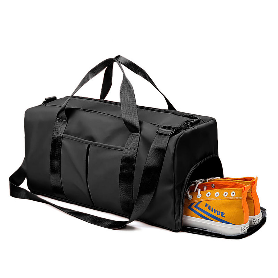 Träningsväska med fack för skor och separat fack som är speciellt utformad för att förvara våta eller smutsiga kläder efter träningspasset, t.ex. strumpor, underkläder, badkläder eller handduk. Tillverkad av slitstarkt nylontyg, vattenavvisande material och foder som andas.