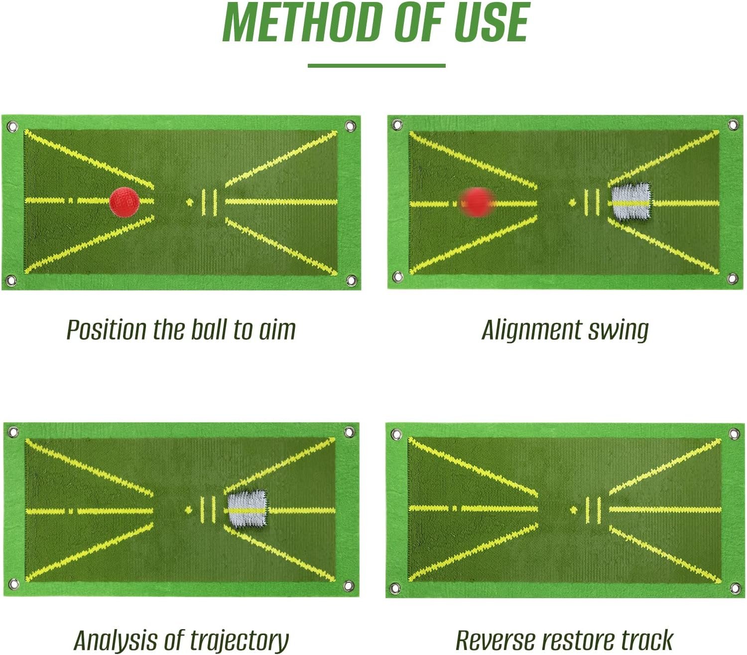 【Golf Swing Träningsmatta】 Denna träningsmatta visar bollens bana efter slaget och hjälper dig att analysera träffpunkten. Använd markeringarna på mattan för att korrigera din position och förbättra din sving.
