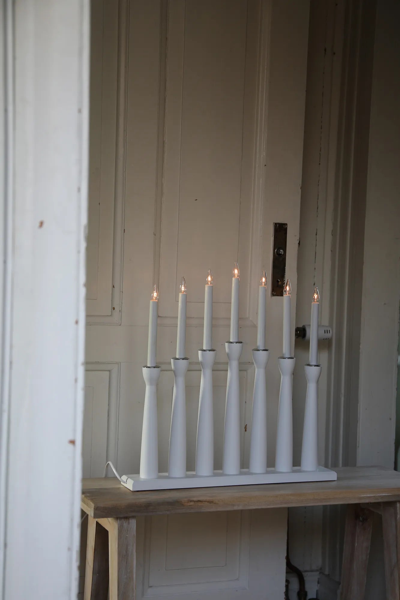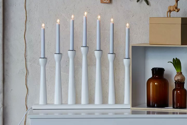 Vacker adventsljusstake från Markslöjd i trä med sju lampor sprider ett behagligt sken i ditt fönster och skapar en behaglig och stämningsfull atmosfär.