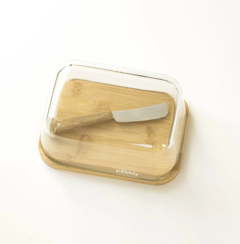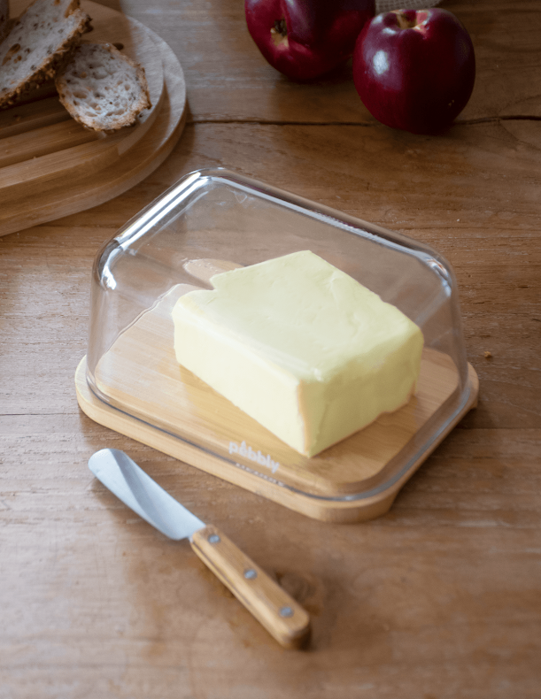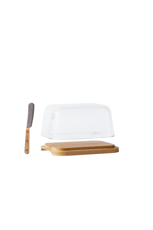 Ett stilrent och praktiskt set från Pebbly som lyfter frukostbordet. Smörasken i glas med bambulock håller smöret fräscht och vältempererat, och med den medföljande smörkniven blir serveringen både smidig och snygg. En enkel detalj som gör skillnad varje dag.