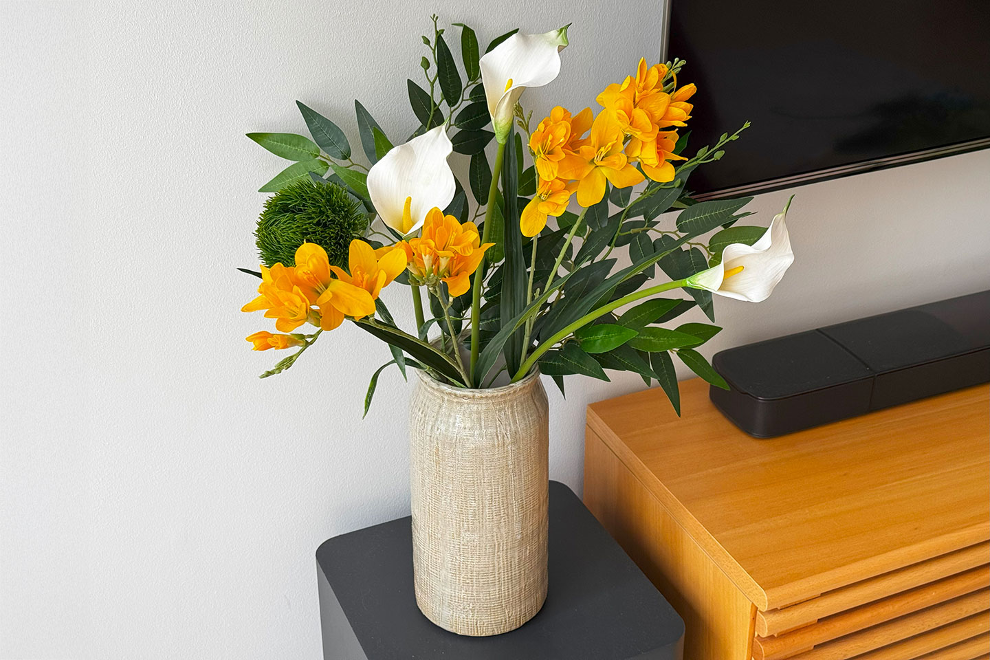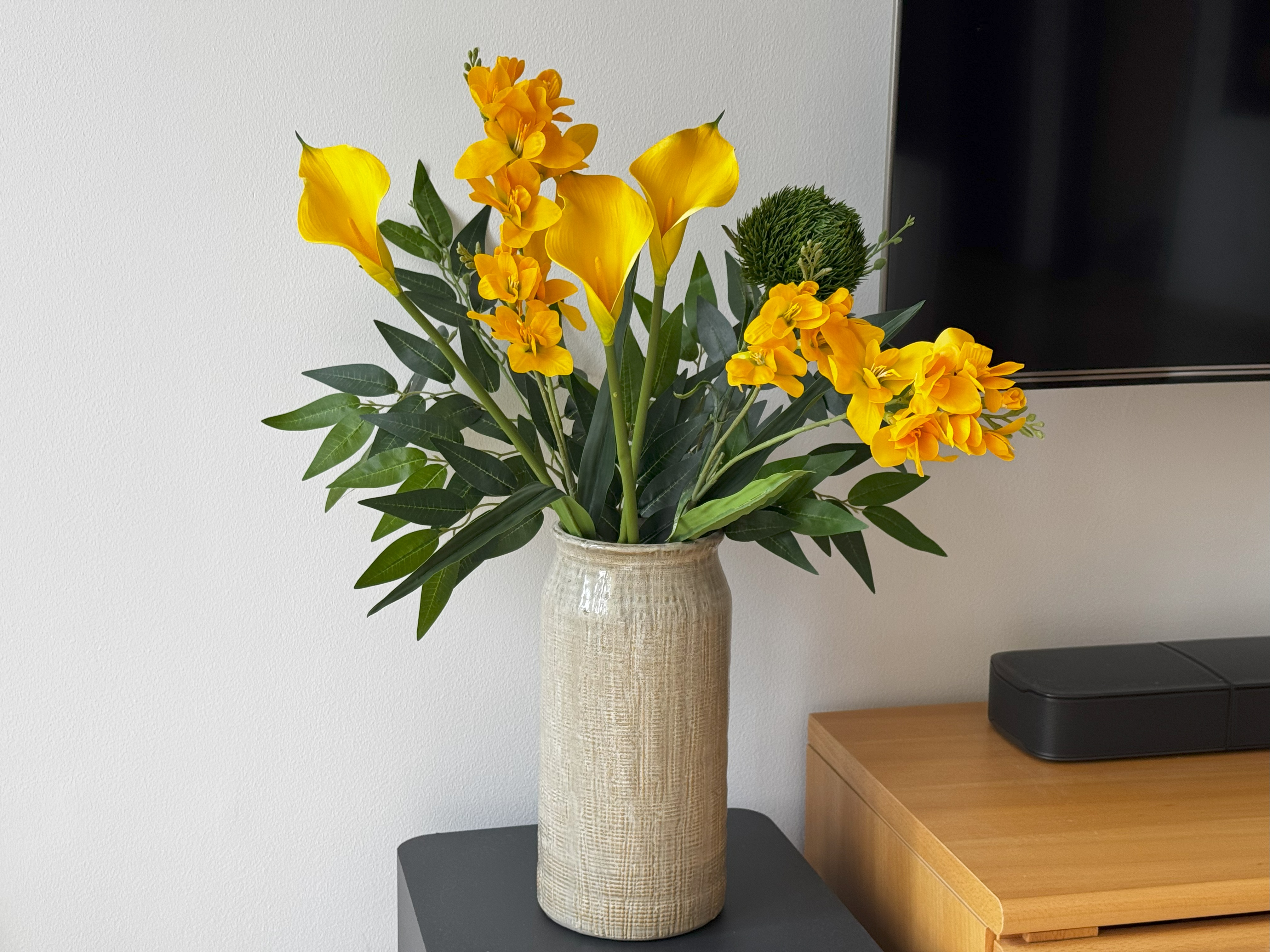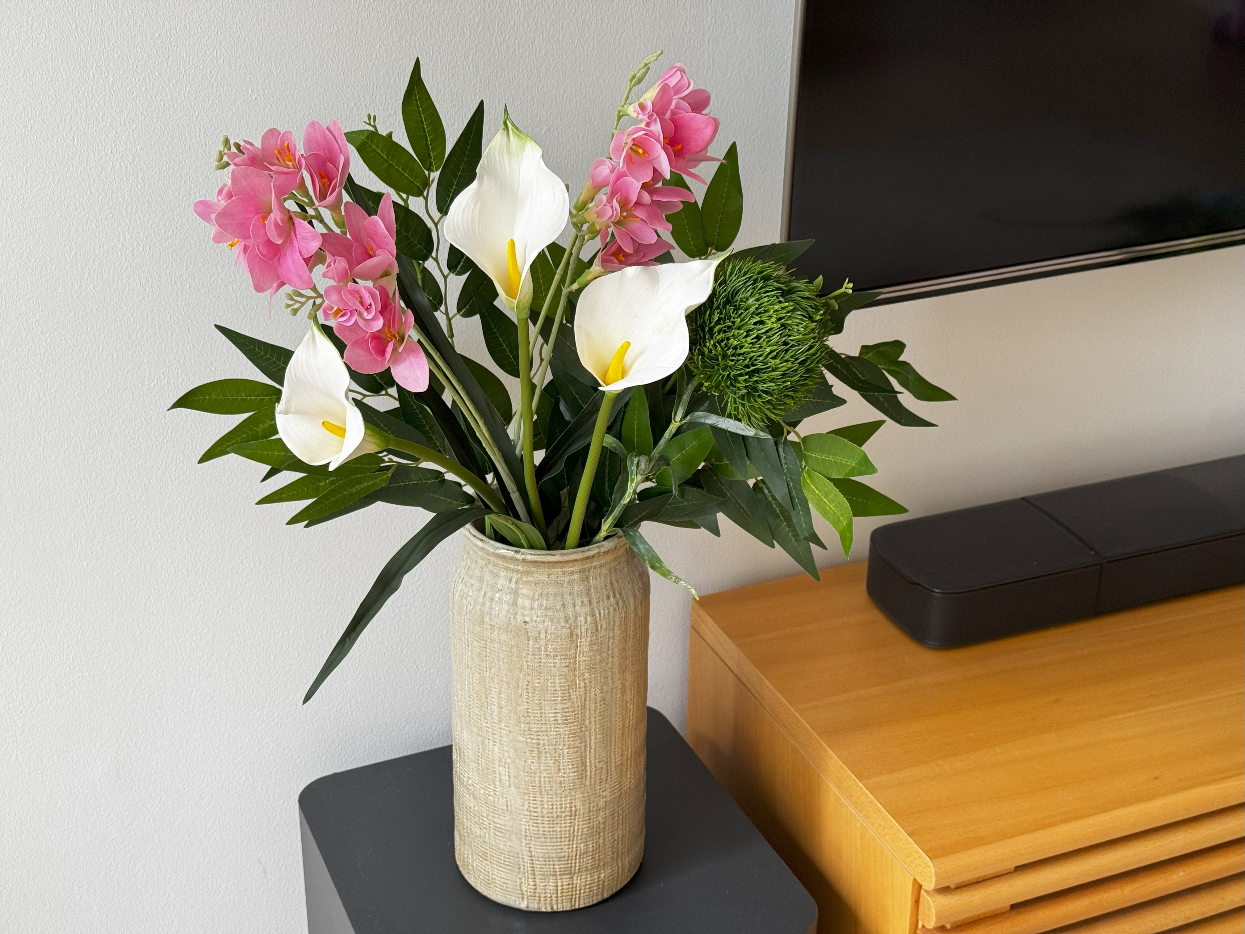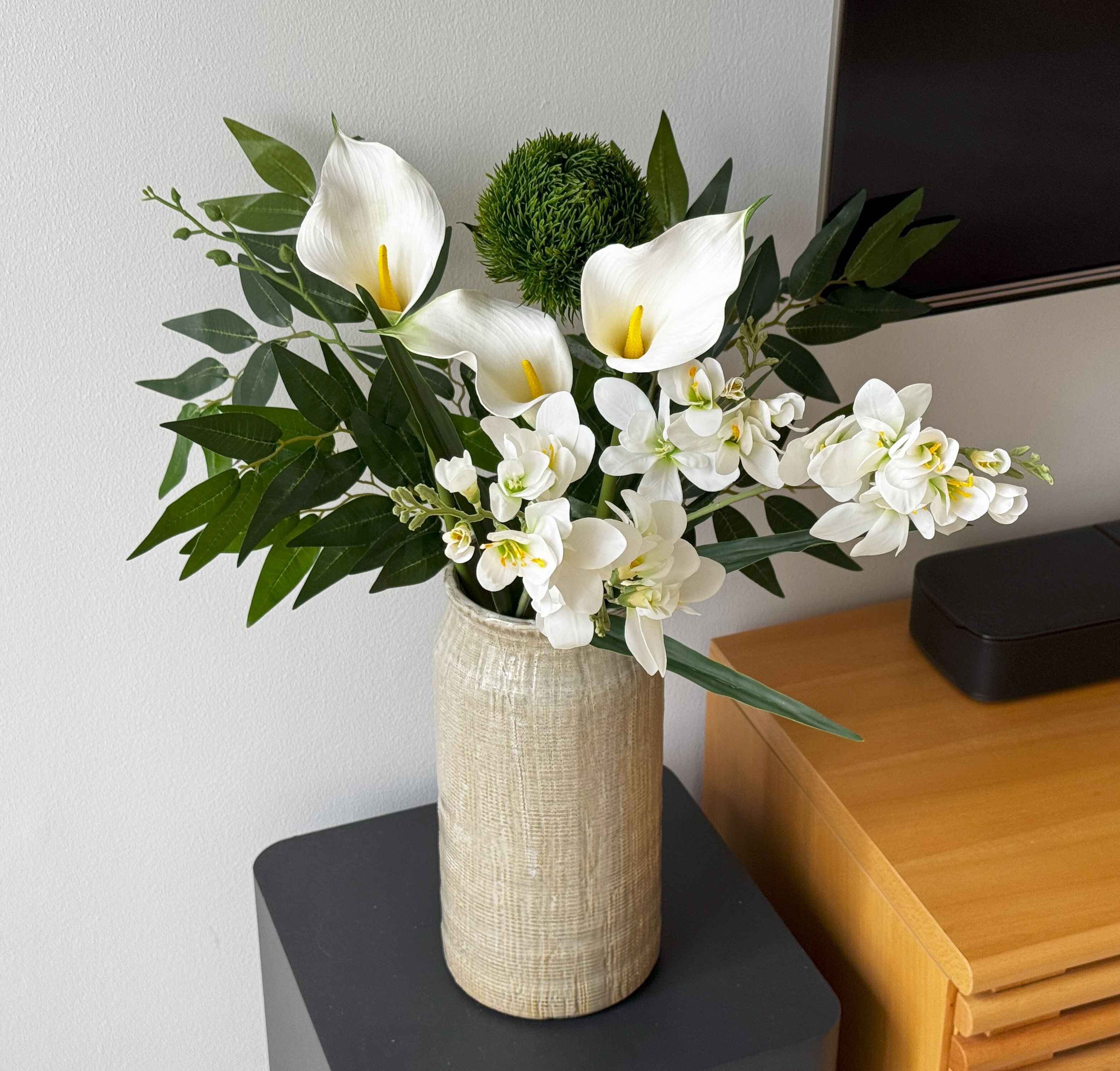 En bukett med konstgjorda blommor att ställa på vardagsrumsbordet eller som en fin dekoration i fönstret. Ger ett ombonat intryck året om utan att kräva skötsel.