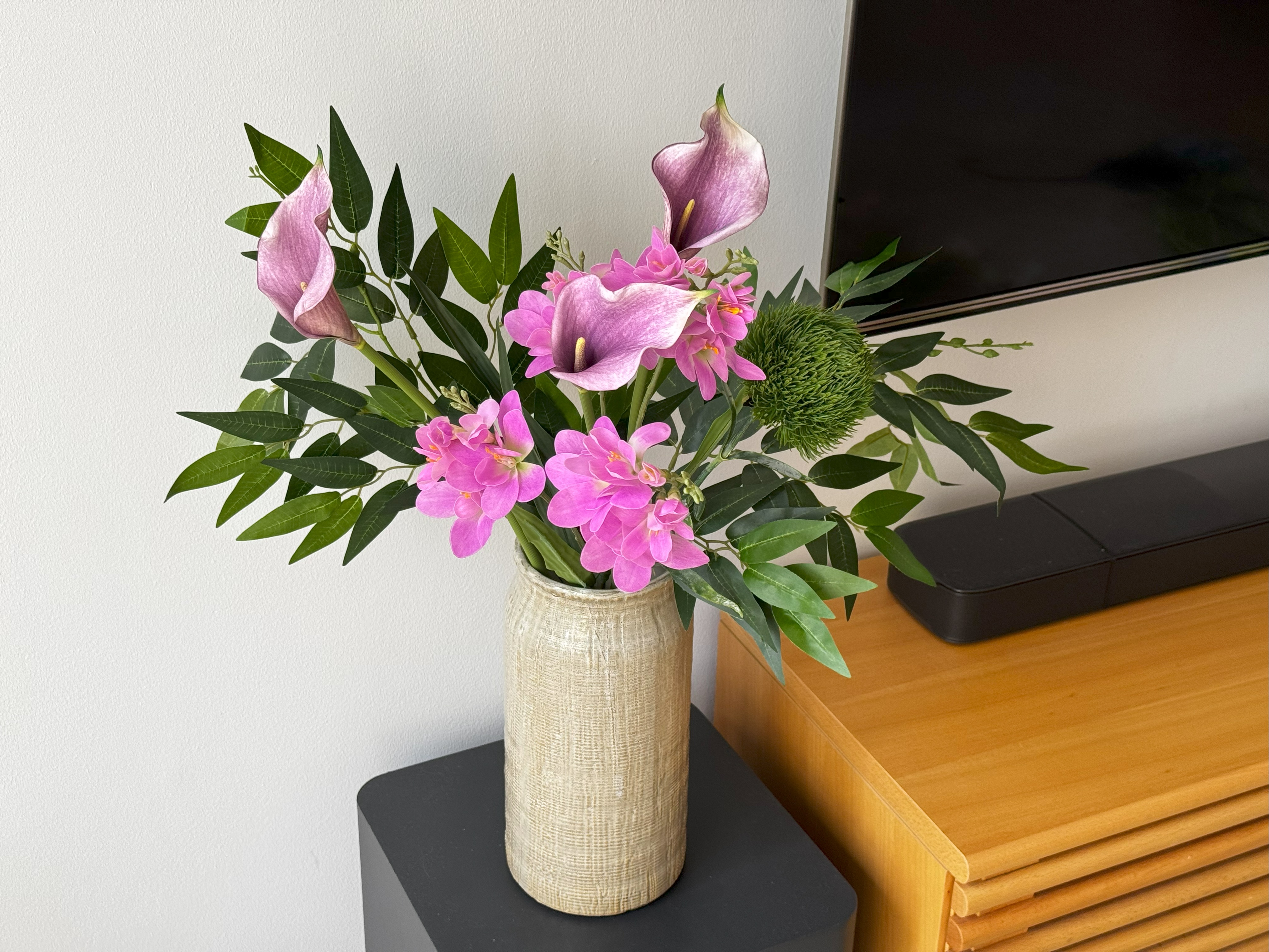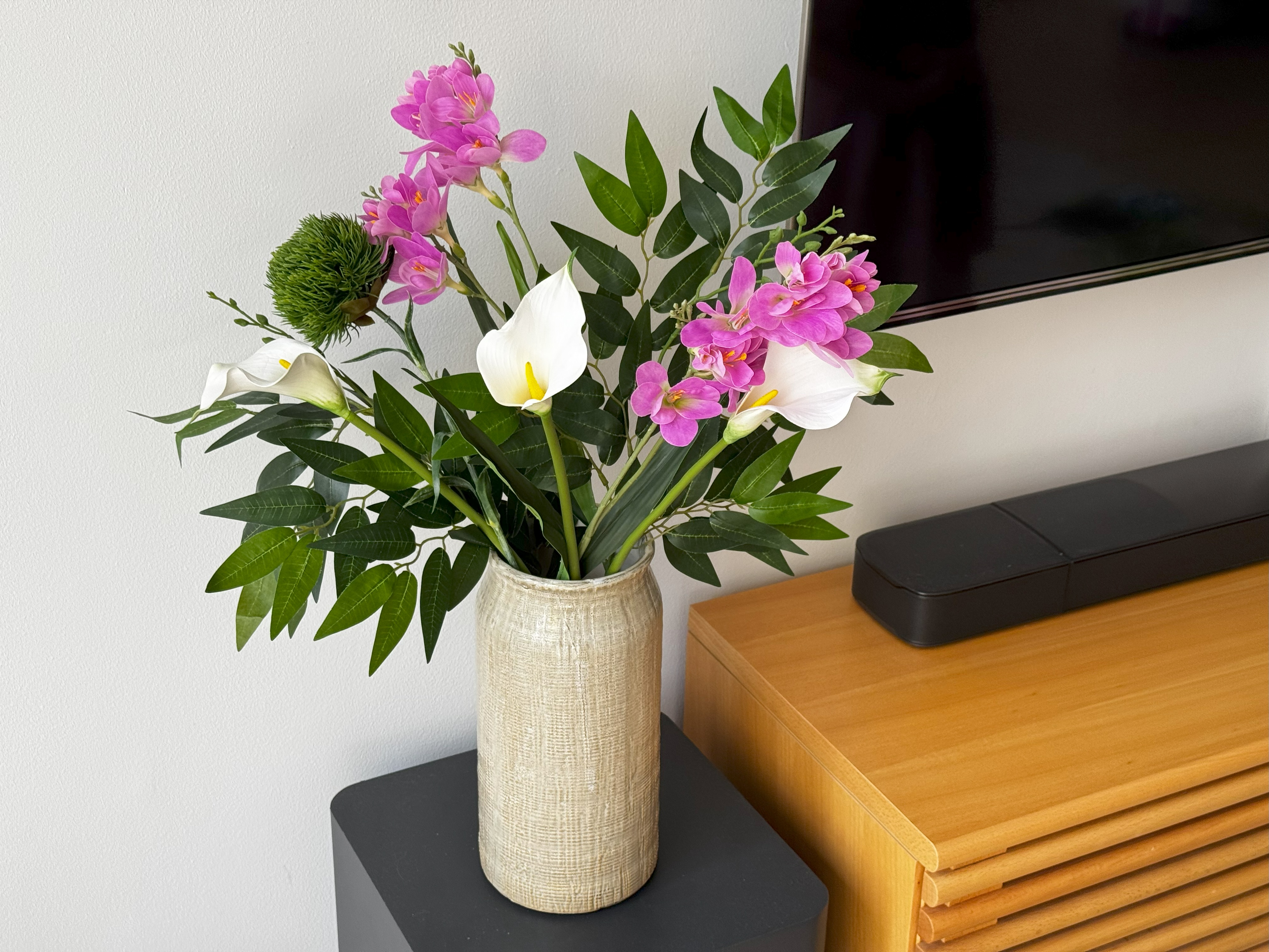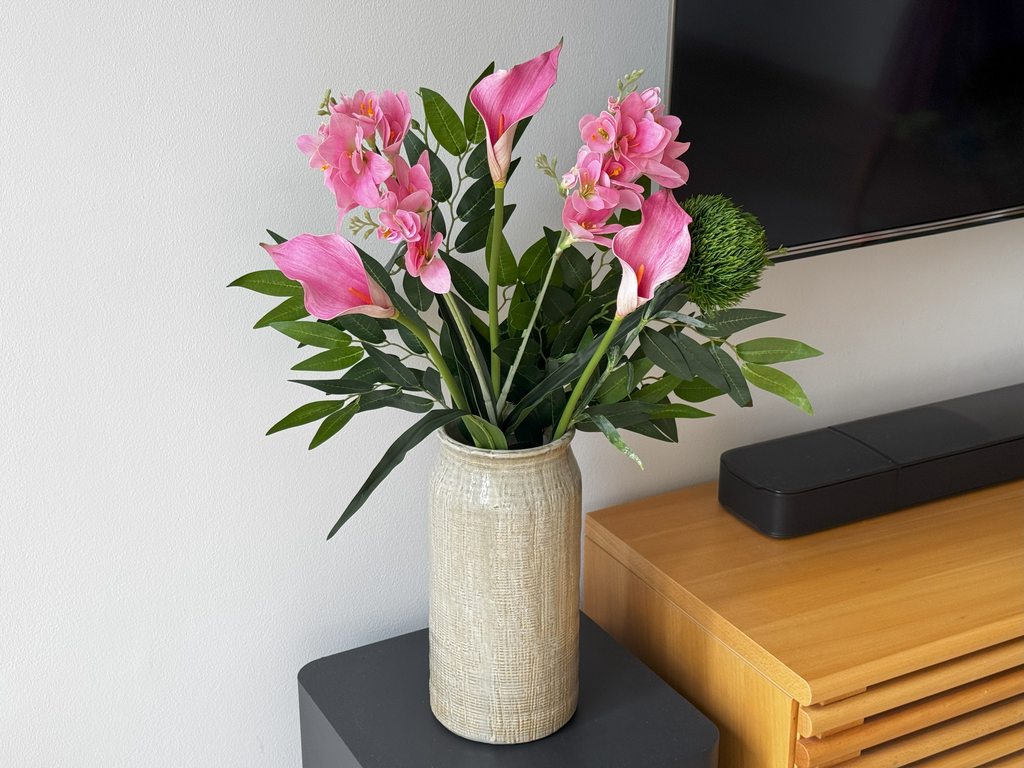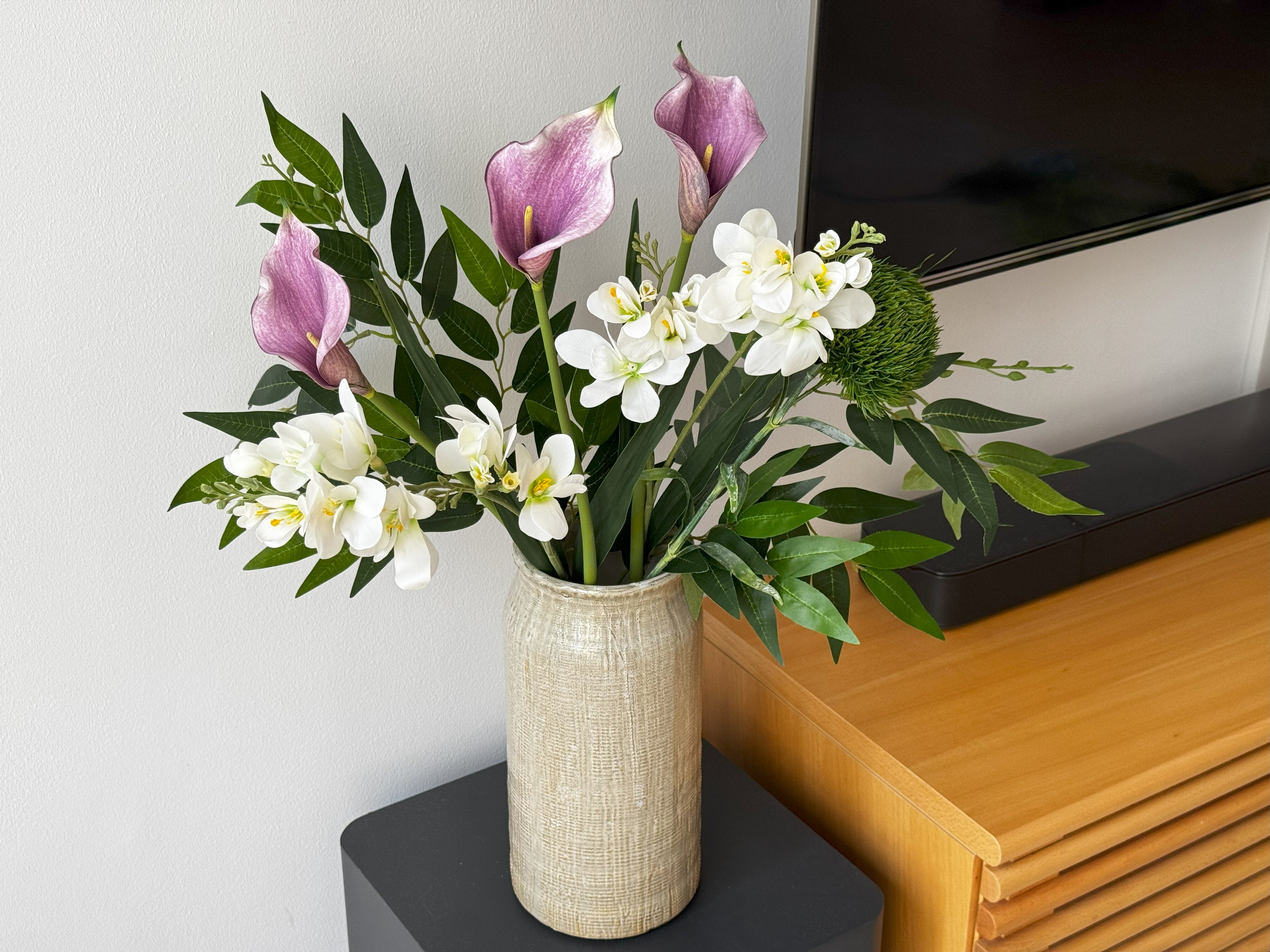 En bukett med konstgjorda blommor att ställa på vardagsrumsbordet eller som en fin dekoration i fönstret. Ger ett ombonat intryck året om utan att kräva skötsel.