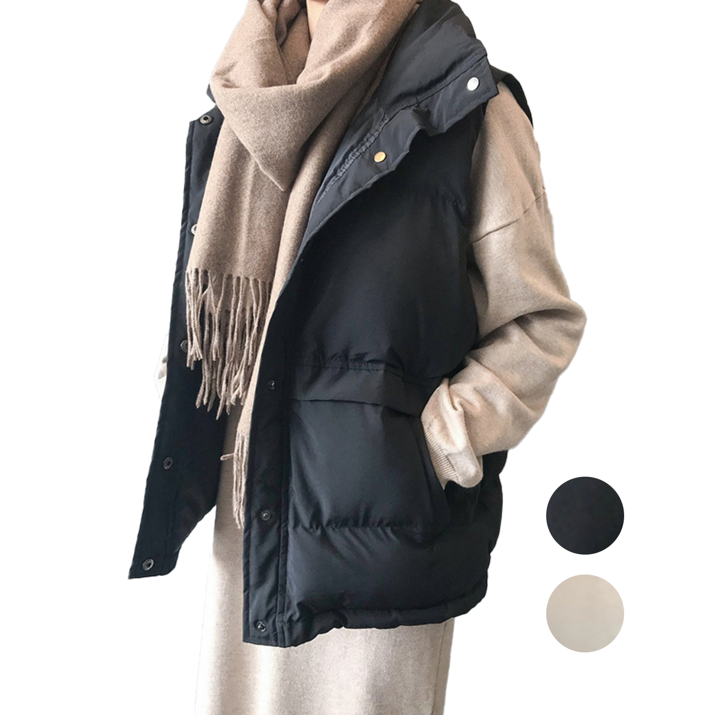 Stilren puffer-väst i vanlig passform som stängs med knappar. Perfekt att bära över en tröja på svalare dagar. Välj mellan svart och beige.