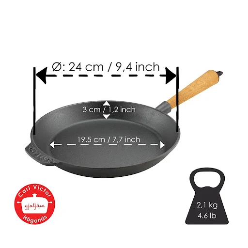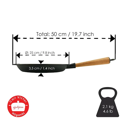 Carl Victor stekpanna i gjutjärn kombinerar traditionellt hantverk med modern funktionalitet. Den handgjutna pannan ger jämn värmefördelning och en naturlig non-stick-yta som förbättras med tiden, helt utan kemiska beläggningar. Det värmeisolerande handtaget i bokträ ger både komfort och stil, medan den robusta konstruktionen gör pannan perfekt för allt från vardagsmatlagning till långkok. En tidlös klassiker som håller i generationer.