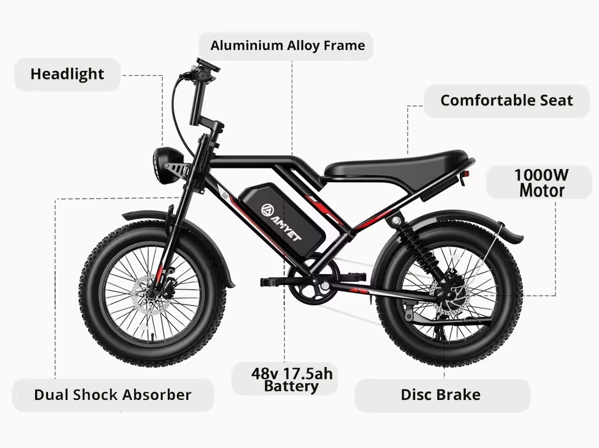 - Mästra Alla Terränger: Förbered dig för att ta dig an alla utmaningar med självförtroende. Vår elcykel är utrustad med 4-tums tjocka däck som erbjuder enastående stabilitet och grepp på alla underlag. Från sandiga stränder till klippiga stigar och stadens gator (i det land där produkten godkänns), inget kan hindra din utforskningslusta.