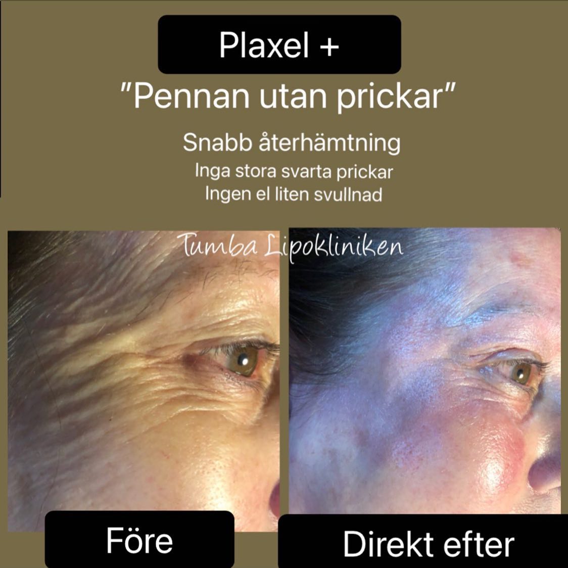 Upplev den senaste tekniken för huduppstramning med Plaxel Plus, plasmapennan som inte lämnar några synliga prickar. Behandlingen stramar upp huden och ger en föryngrad look med minimal svullnad och kort återhämtningstid. Redan dagen efter syns endast små skorpor vilket gör att du snabbt kan återgå till vardagen, något som gör Plaxel Plus unik.