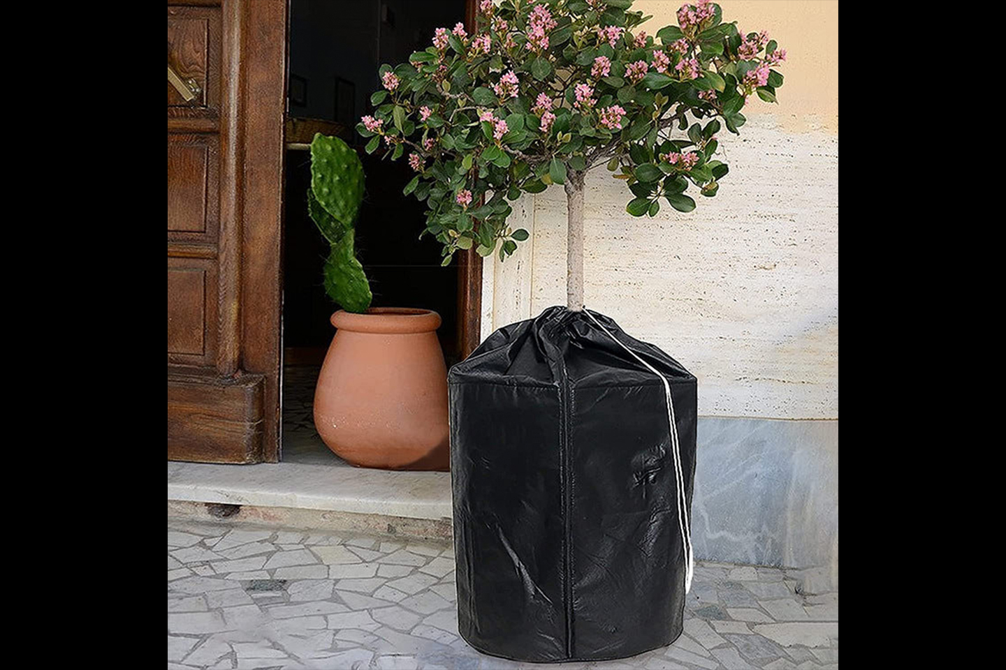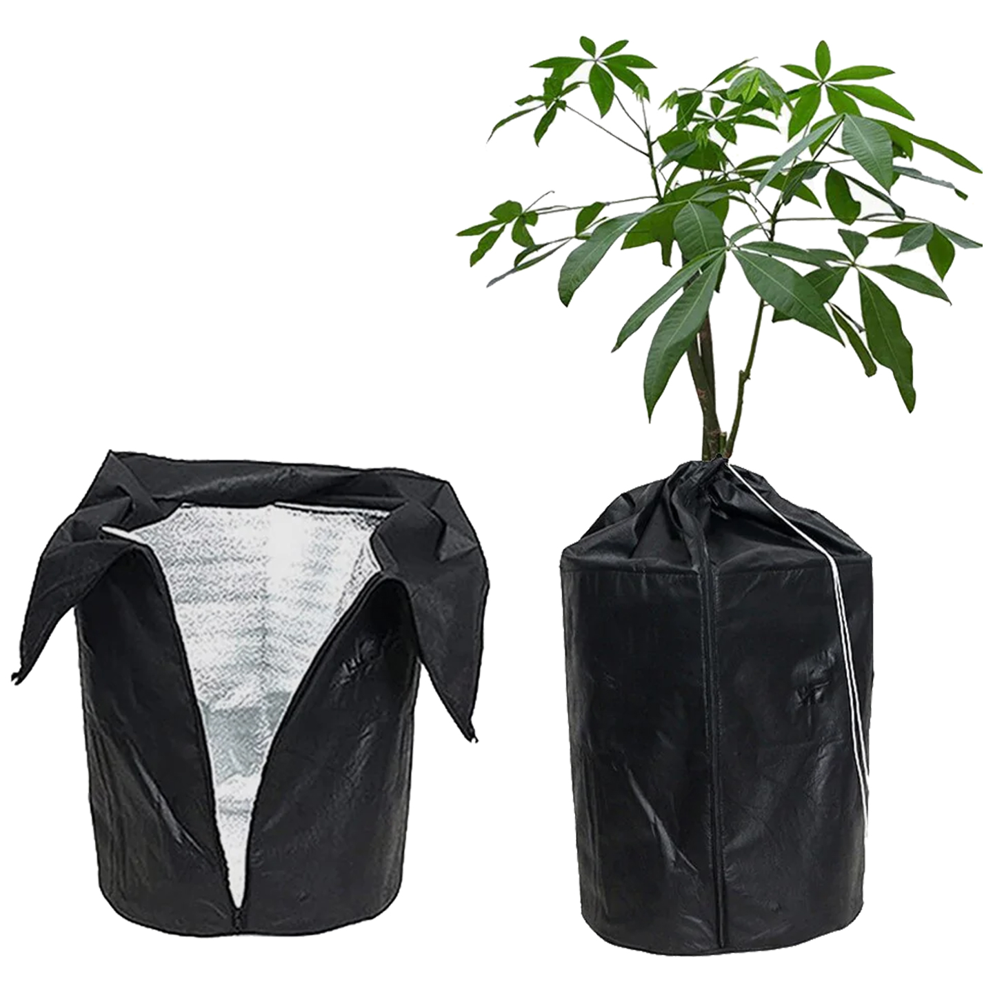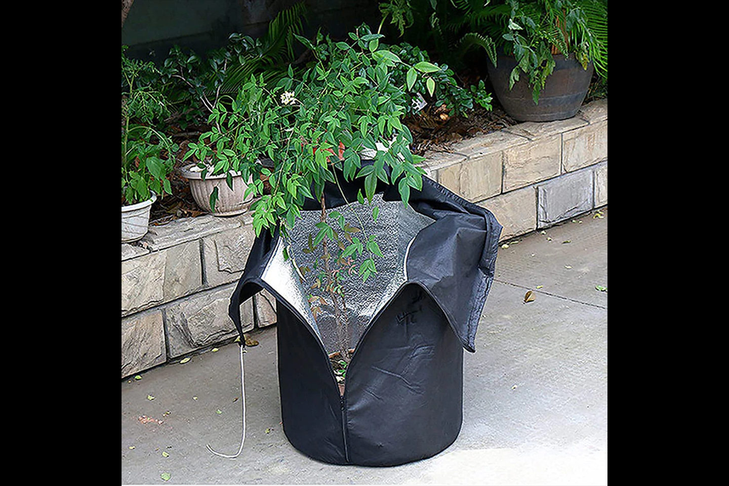 Frostskydd för krukväxter som skyddar uteväxten från frost och frysning på vintern. Krukskyddet har dragsko och dragkedja för enkel montering.