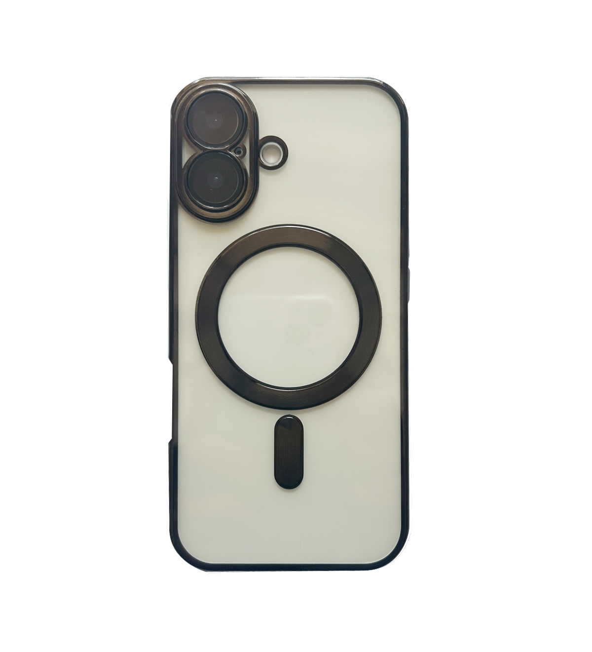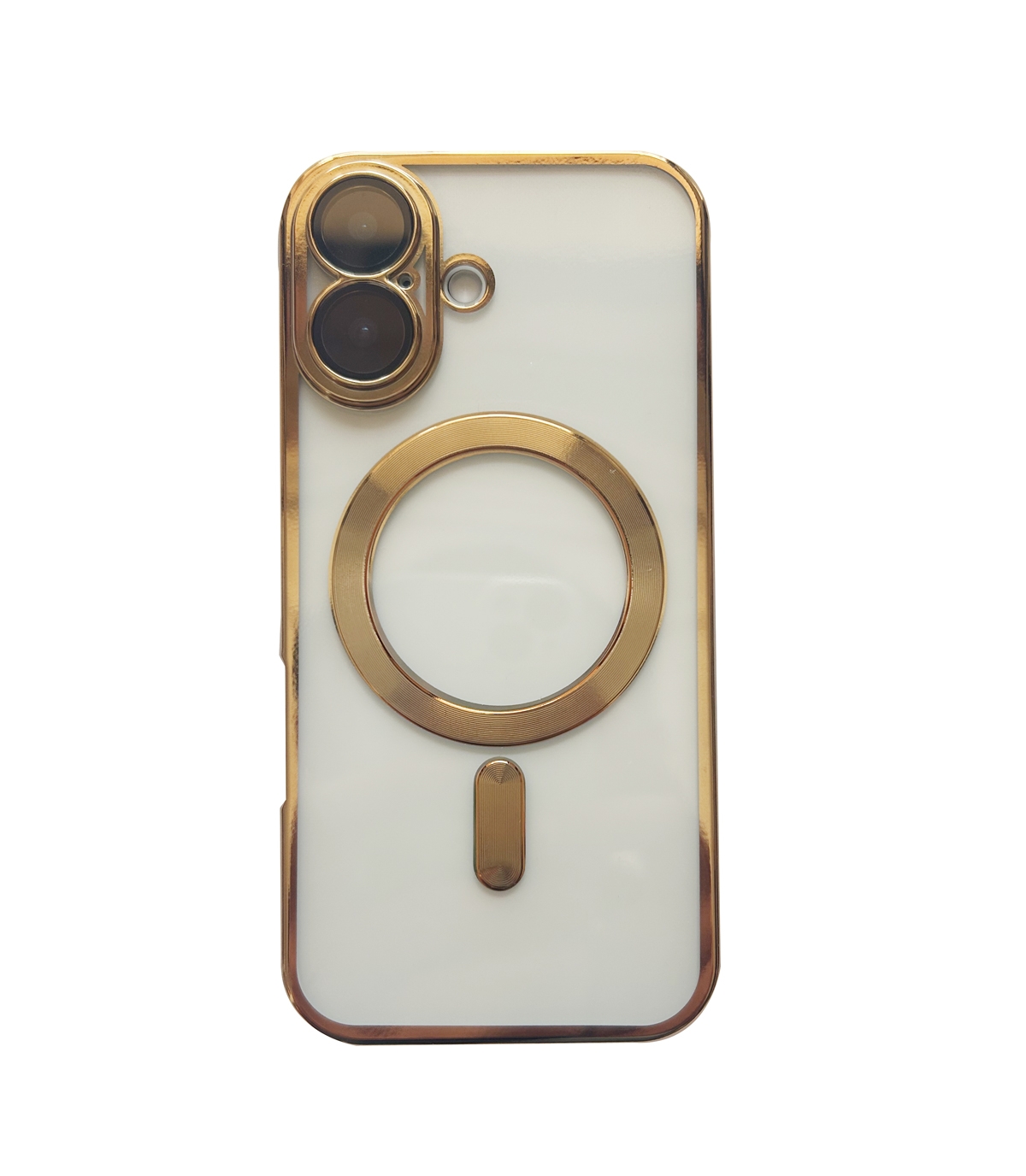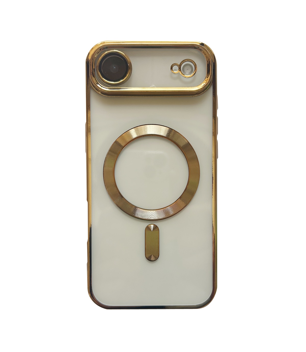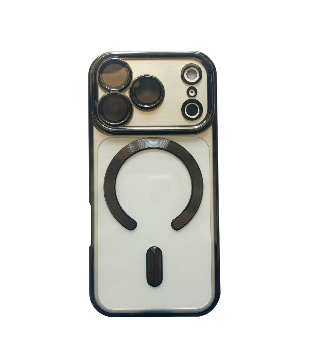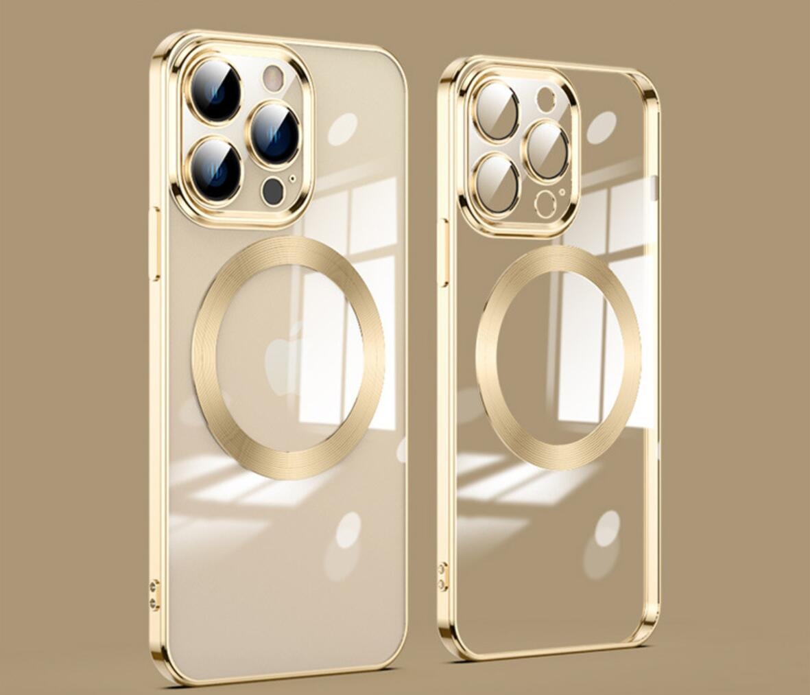 Stilrent MagSafe-skal i svart, guld eller silver för iPhone 15 till 17. Skyddar kamera och skärm – stödjer alla MagSafe-tillbehör.