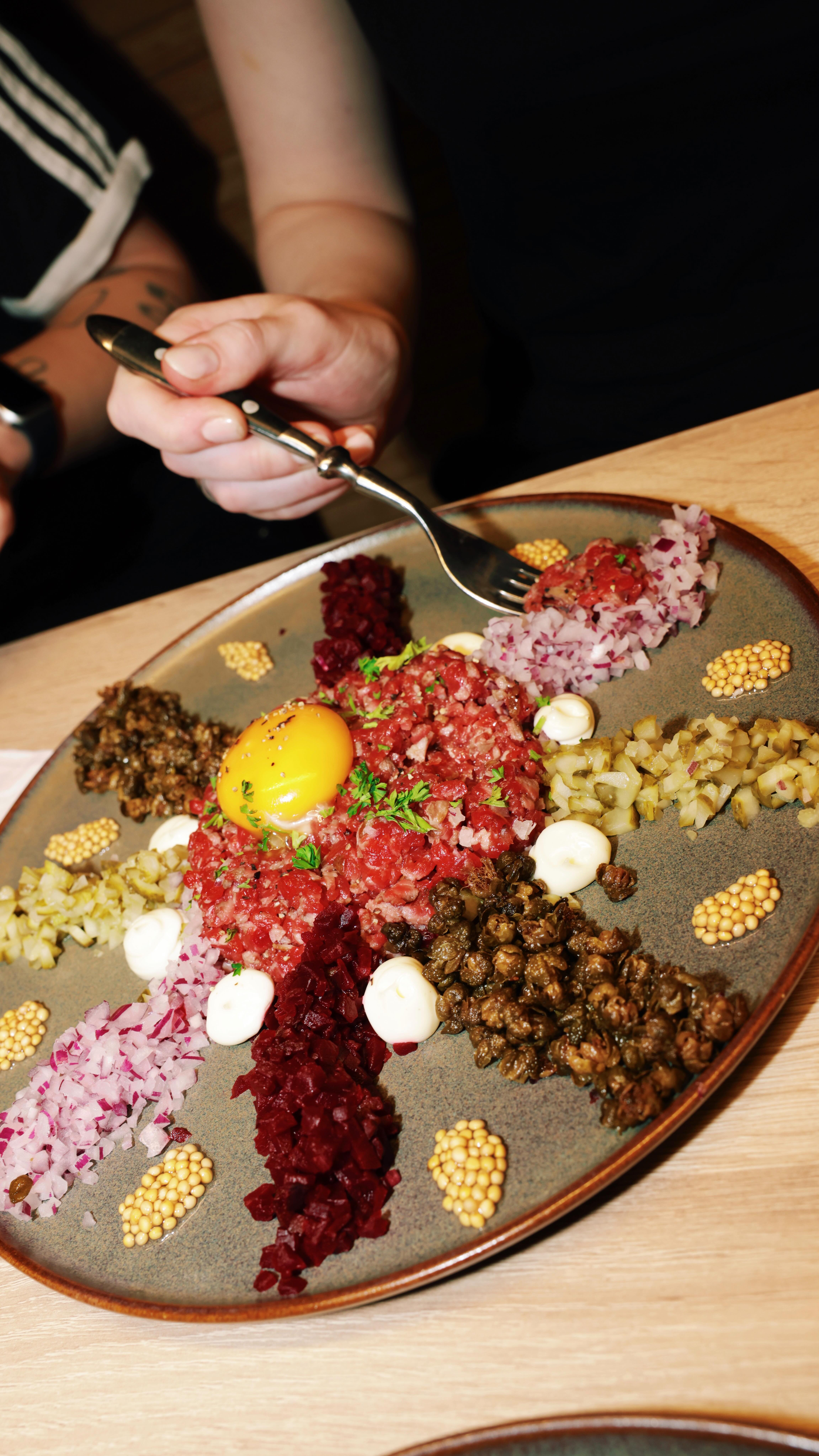 Råbiff med focaccia, jordärtskocka, senapsfrön och dragon. Vegetariskt alternativ med betor.