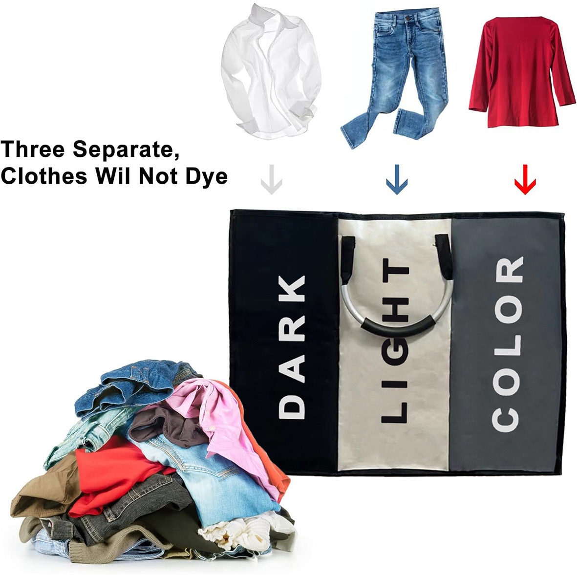 Förenkla tvättsorteringen med denna snygga och praktiska tvättkorg med 3 separata fack märkta ”Dark”, ”Light” och ”Color”. Tillverkad i slitstarkt oxford-tyg och stabil aluminiumram för maximal hållbarhet och lätt hantering. Perfekt för varje tvättrum eller badrum.