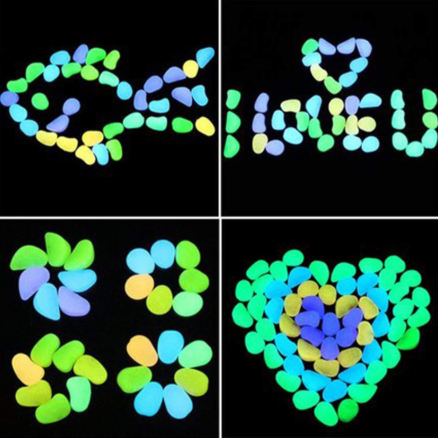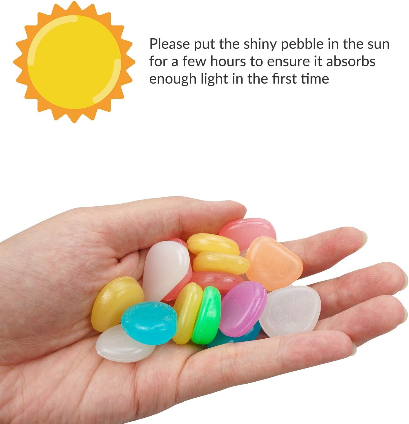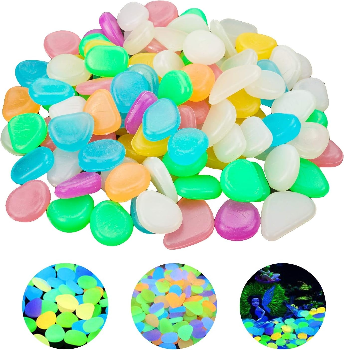 Färgglada stenar för trädgården som lyser i mörkret. Perfekt för trädgården, akvariet eller parkeringsplatsen. Giftfria och säkra att använda. Stenarna behöver solljus under dagen för att kunna lysa