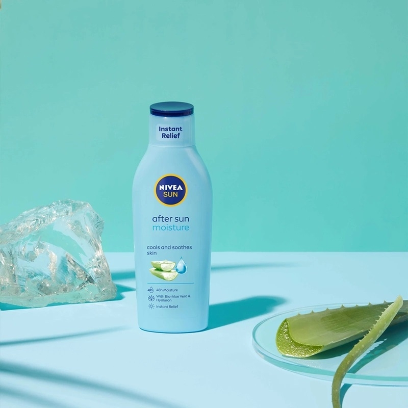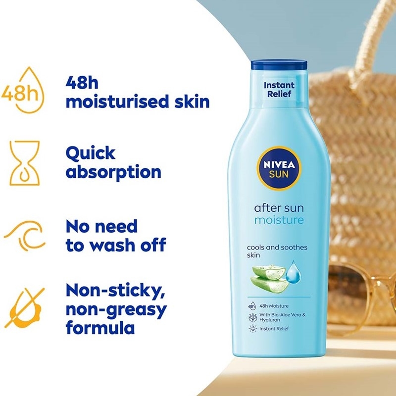 Nivea Sun After Sun Moisture Lotion har en lätt formula och innehåller Aloe Vera. Produkten absorberas snabbt och återställer hudens fuktbalans för en lugnande och uppfriskande effekt. Produkten är berikad med provitamin B5 och Vitamin E som lindrar huden efter en dag solen.