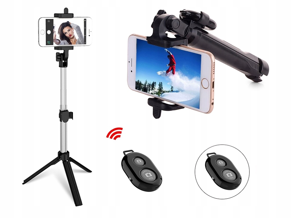 Setet innehåller en monopod med möjlighet att fällas ut till ett stativ och en fjärrkontroll för fotografering.