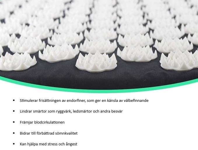 Upplev naturlig smärtlindring och avslappning med spikmatta och kudde som stimulerar kroppens tryckpunkter. Piggarna främjar blodcirkulationen, lindrar muskelspänningar och bidrar till bättre sömn och välbefinnande. Perfekt för att minska stress, stelhet och värk efter en lång dag.