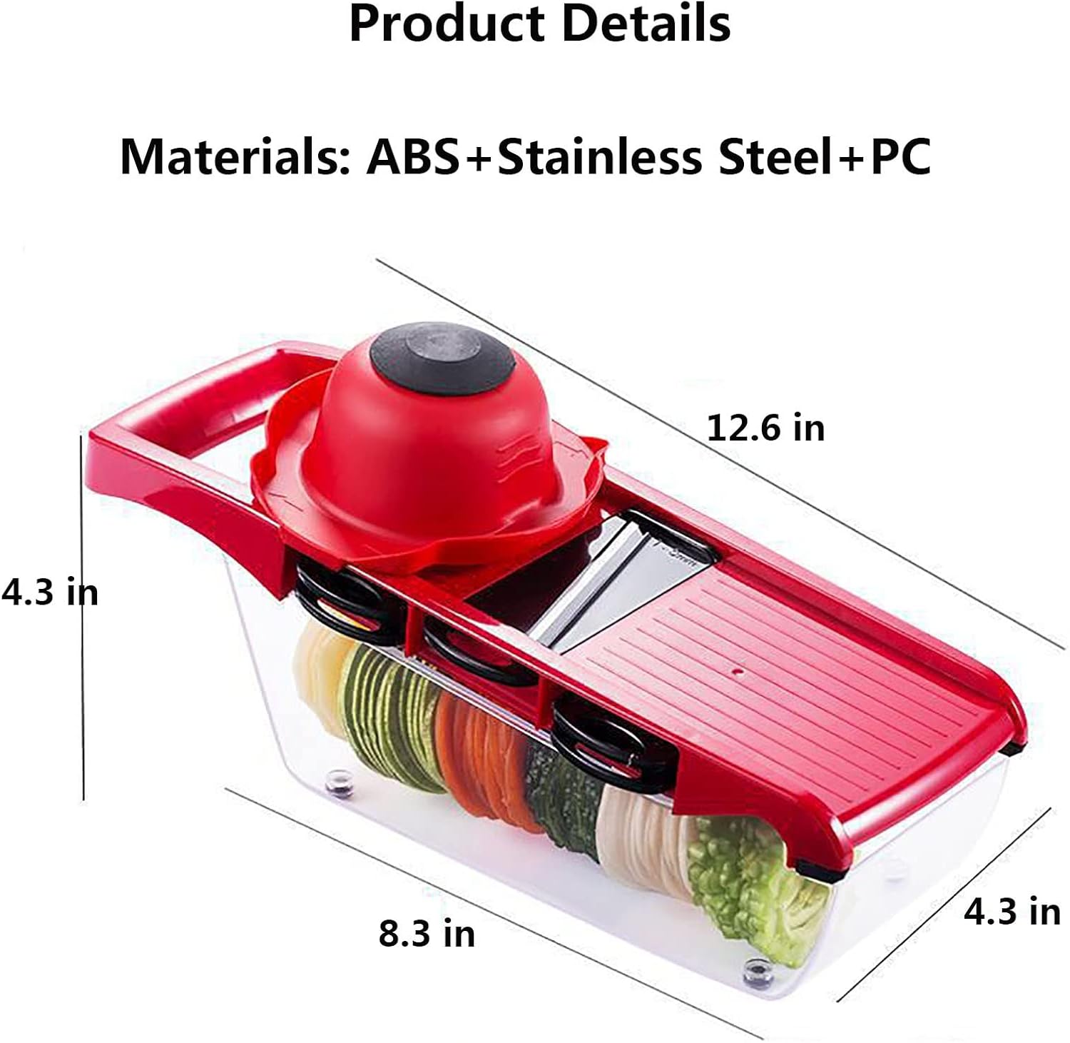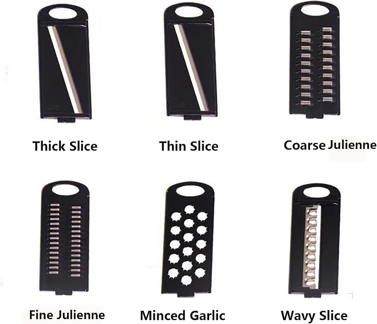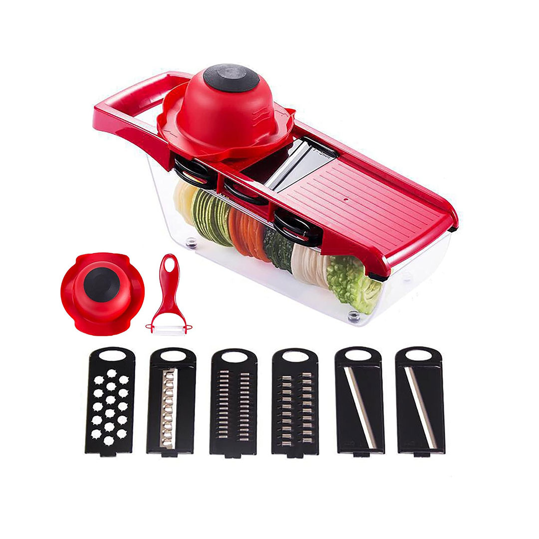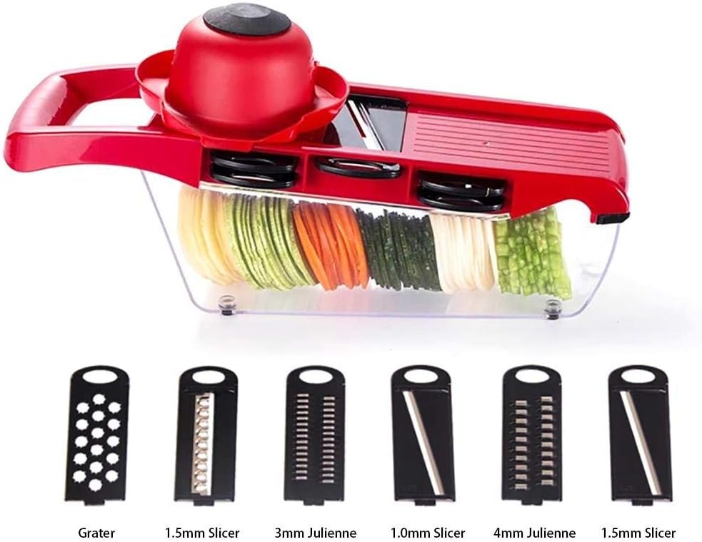 - Paketet innehåller: 6x blad i rostfritt stål, 1x mandolinskärare, 1x handtag, 1x skalare
