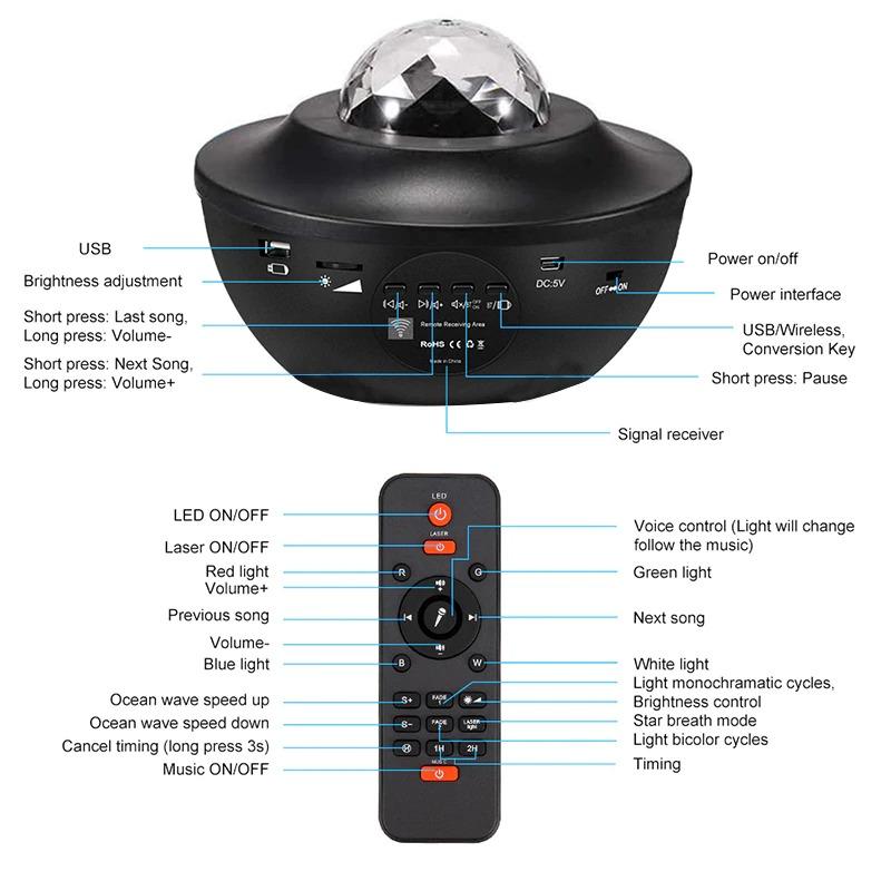 - Användning: Skapar stjärnhimmel och galaxljus med musik och timer