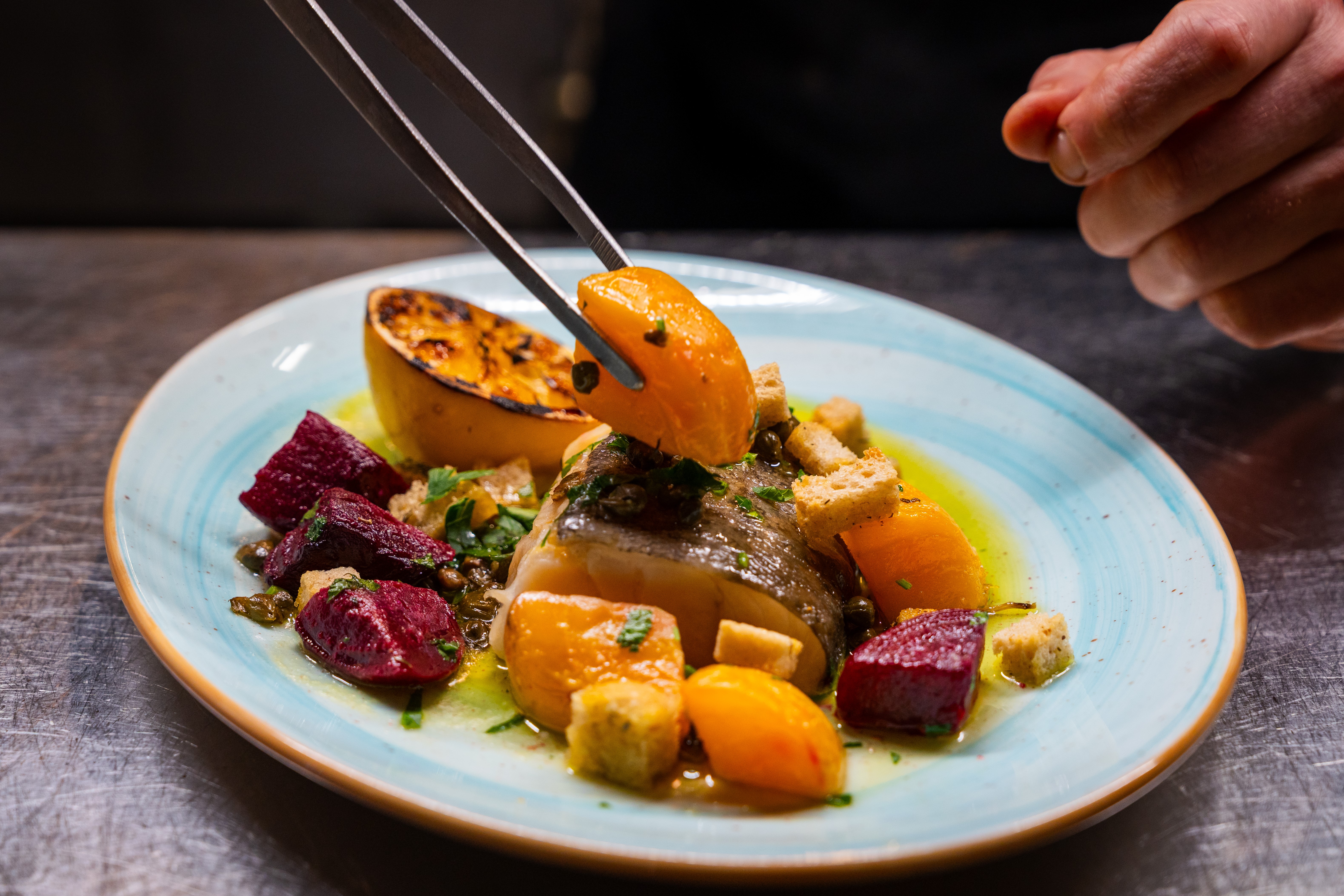 Ugnsbakad Skreitorsk med betor & potatispuré. Serveras med brynt smör, kapris, persilja, citron & krutonger