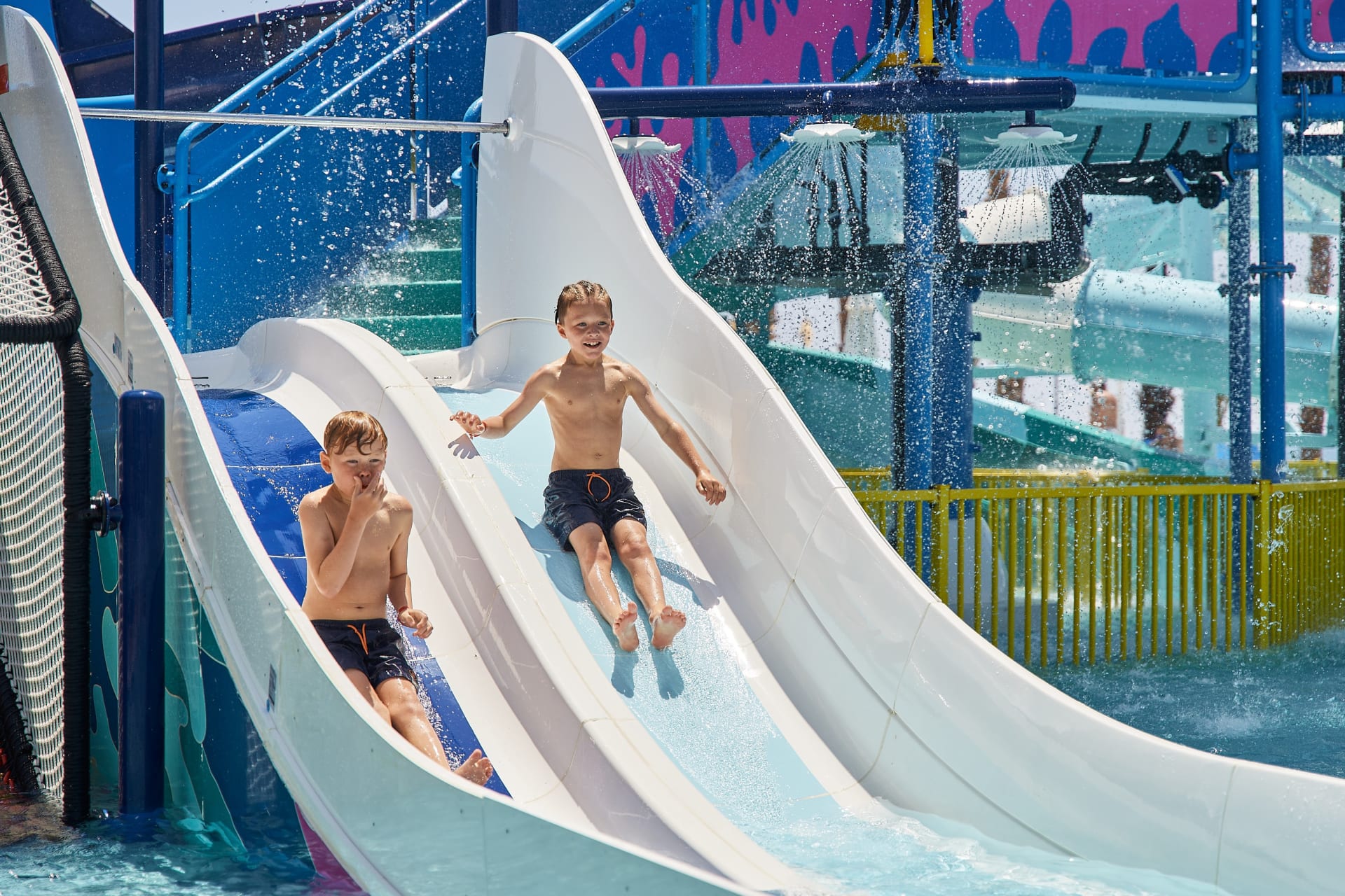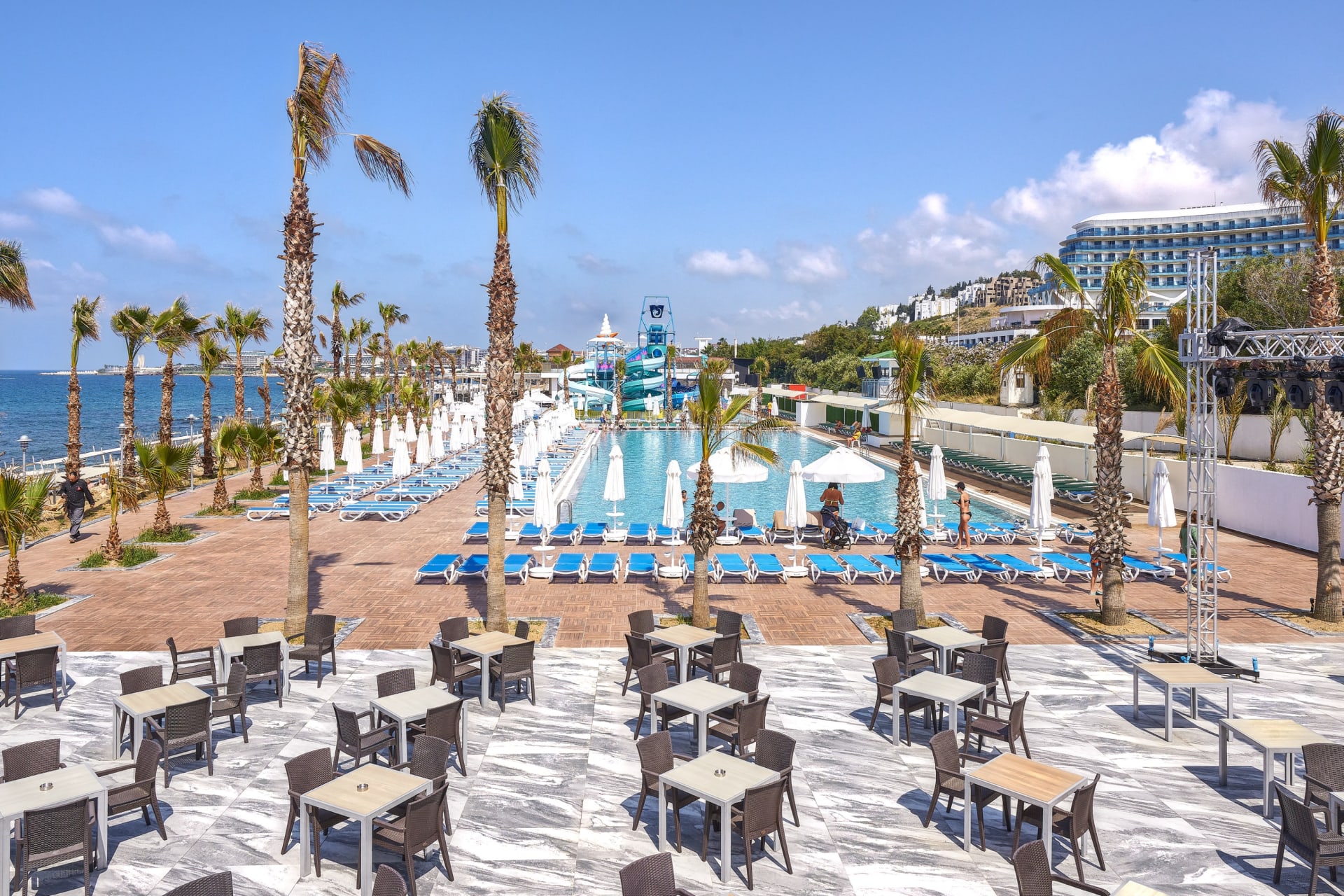 Poolområdet är en av anläggningens stora höjdpunkter med flera stora utomhuspooler, soldäck och fantastisk havsutsikt. Runt poolerna finns gott om solstolar och parasoll. För den som söker fart och fläkt finns ett område med vattenrutschkanor som passar både äldre barn, ungdomar och vuxna. Vid poolerna finns barer där gäster kan hämta dryck och snacks under dagen.