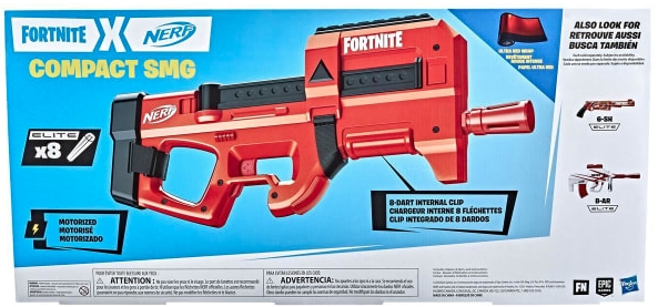 Få spelens spänning till livet med NERF Fortnite Compact SMG! Inspirerad av den populära utrustningen i Fortnite-spelet, har denna blaster den distinkta Ultra Red Wrap-designen och erbjuder kraftfullt, motoriserat dartskjutande nöje. Perfekt för snabba strider, denna blaster avfyrar 8 darts i följd genom att enkelt hålla ner accelerationsknappen för att aktivera motorn och sedan dra avtryckaren. Inkluderar 8 officiella NERF Elite-skumdartar som laddas i blasterens interna 8-darts magasin.