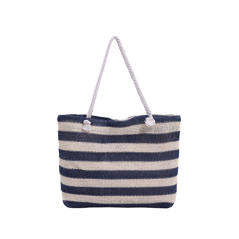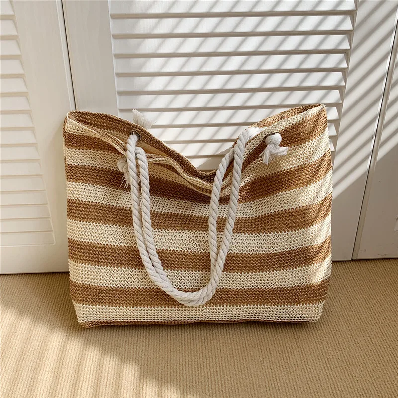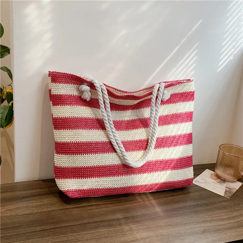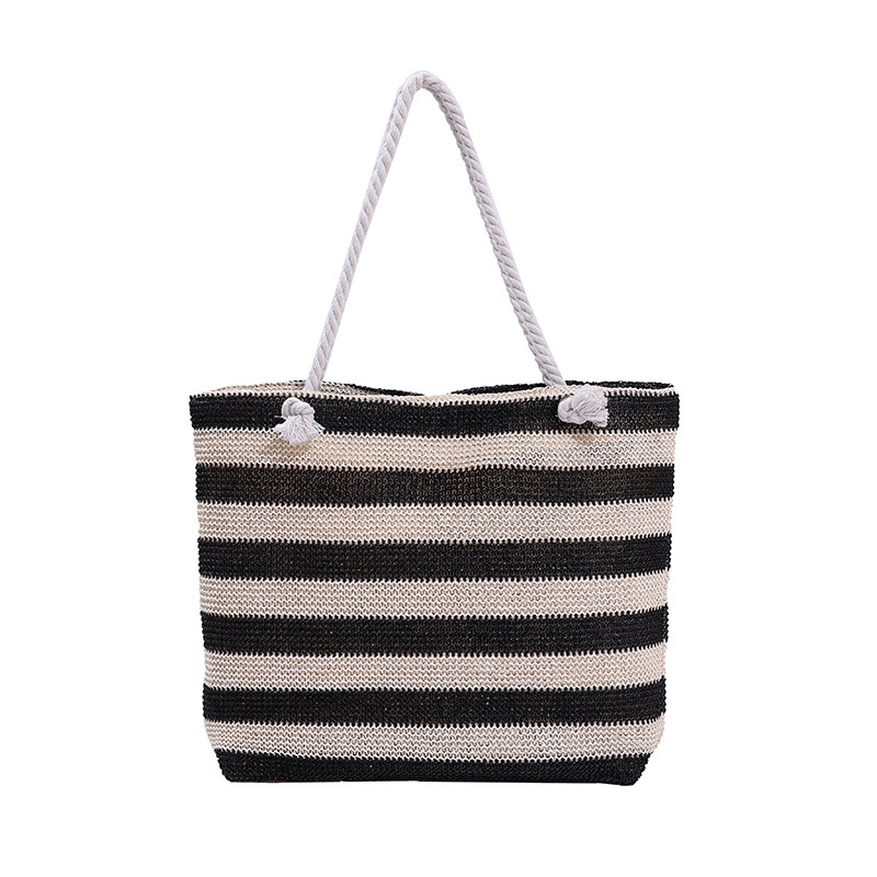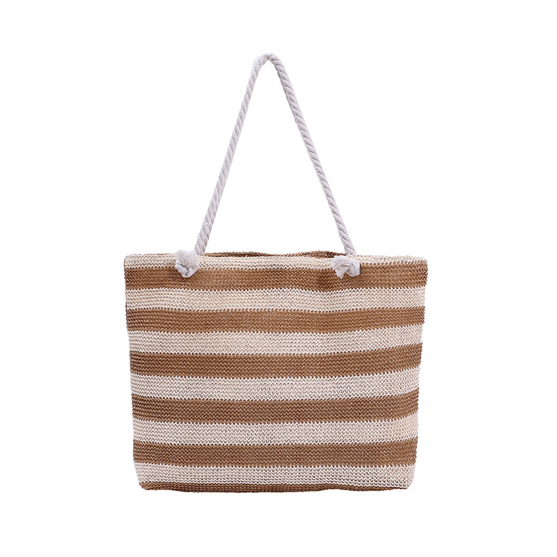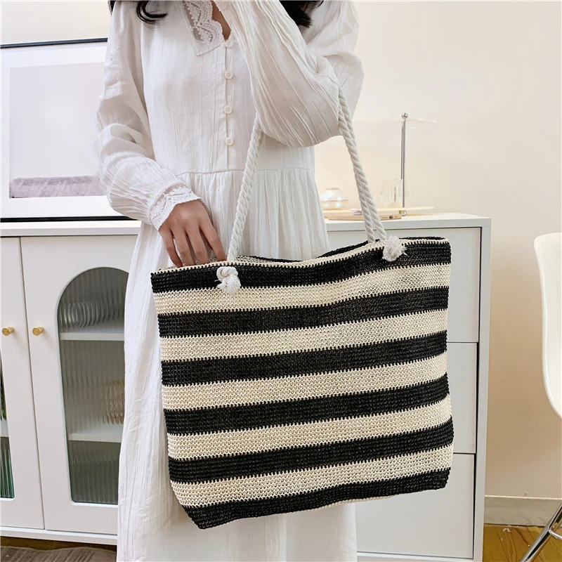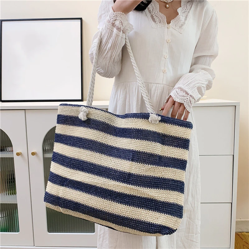 En stilren och funktionell väska för både strand och stad. Denna väska i vävd halm kombinerar ett klassiskt randigt mönster med en rymlig design. Perfekt för soliga dagar på stranden, eller som en praktisk och snygg shopper till vardags.
