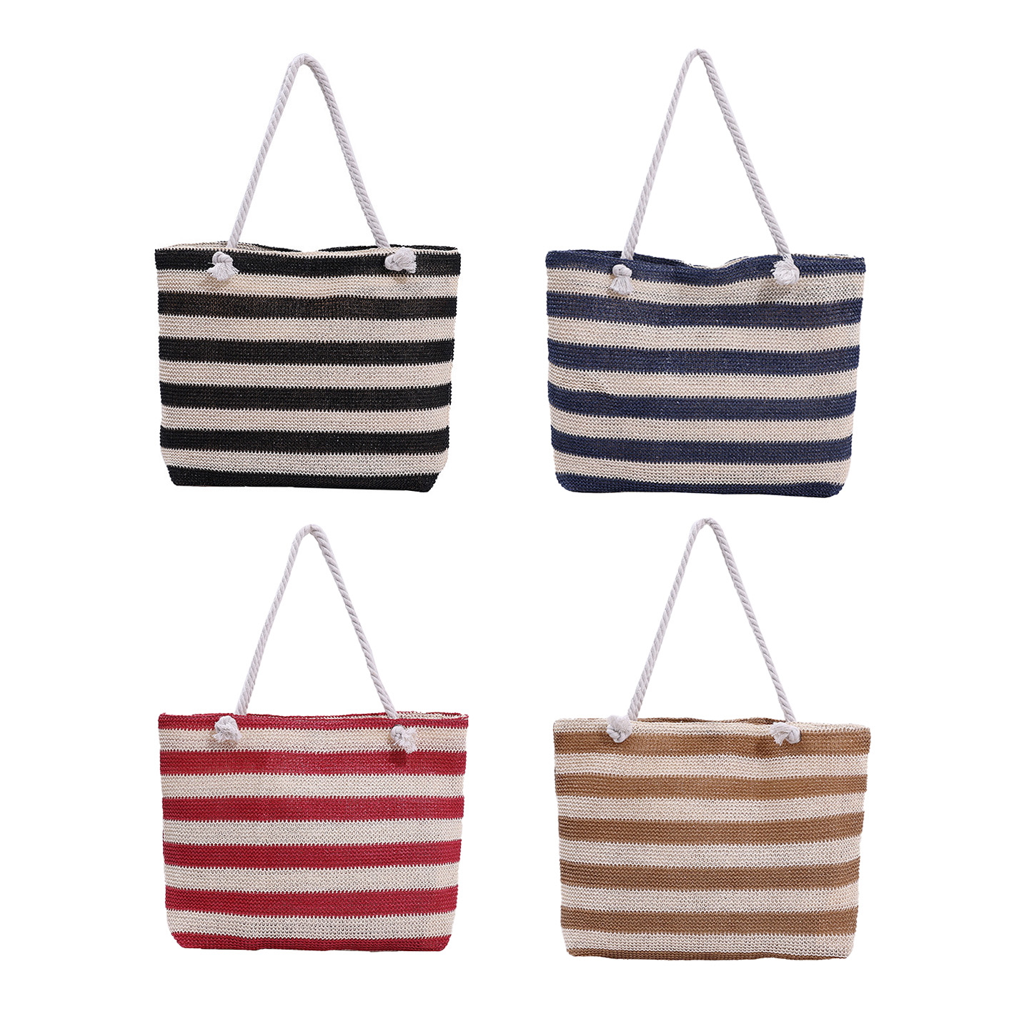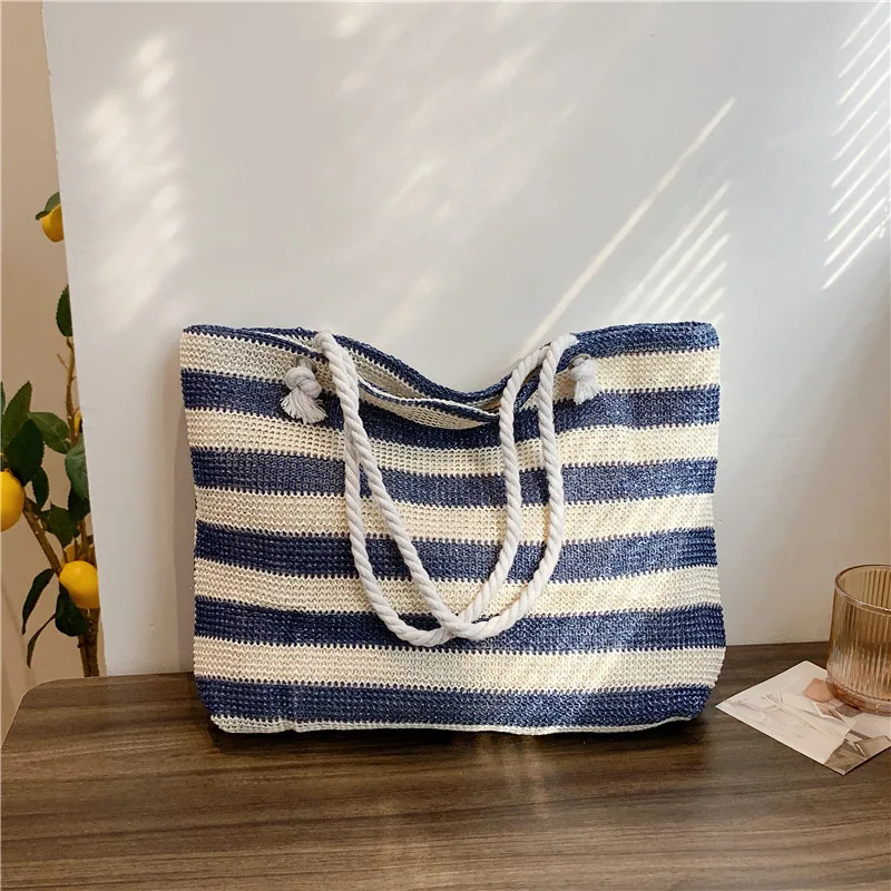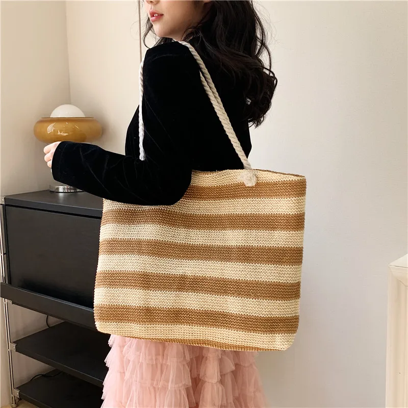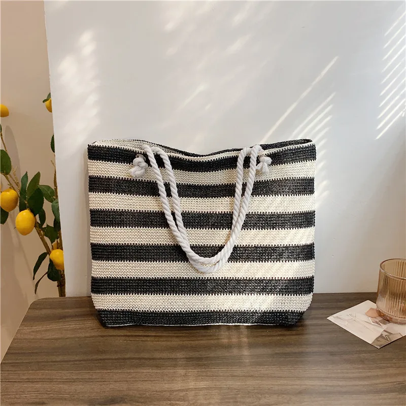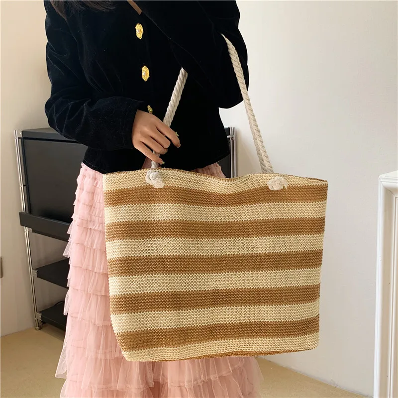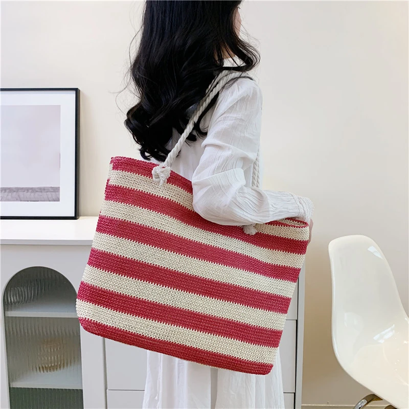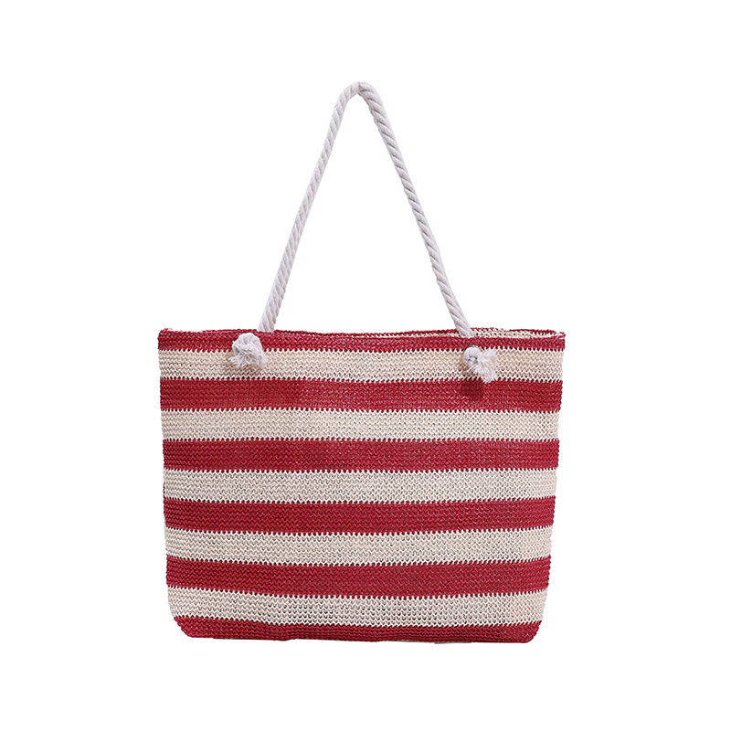 En stilren och funktionell väska för både strand och stad. Denna väska i vävd halm kombinerar ett klassiskt randigt mönster med en rymlig design. Perfekt för soliga dagar på stranden, eller som en praktisk och snygg shopper till vardags.