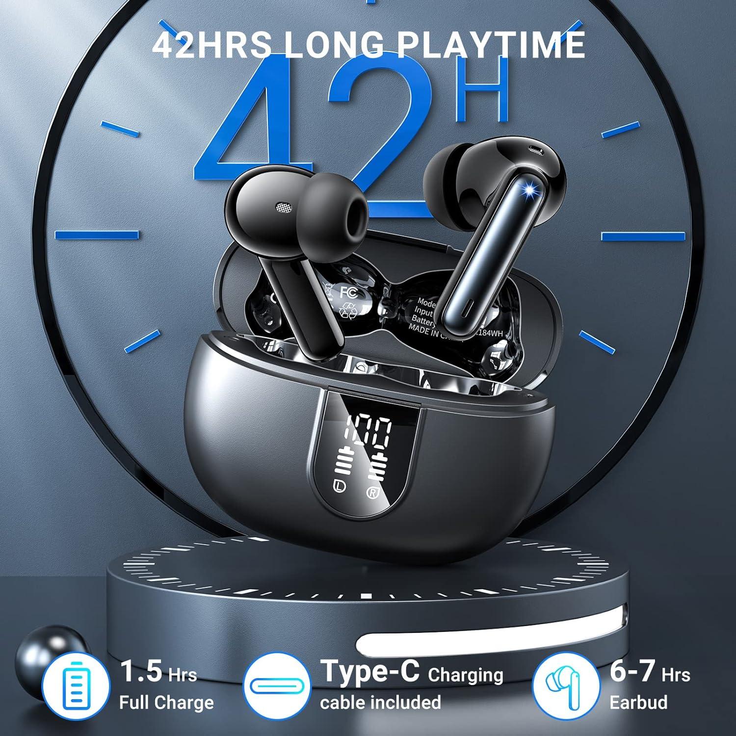 LED-DISPLAY & 30TIMMARS SPELTID: Separat LED-design för batterinivån på de trådlösa hörlurarna, så du kan tydligt se laddningsnivån på varje hörlur och laddningsfodralet. Hörlurarna levereras med ett laddningsfodral med USB-C-laddningskabel, och det tar endast 1,5 timmar att ladda helt upp fodralet med hjälp av kabeln. Hörlurarna erbjuder 6-7 timmars musiklyssning (vid 50% volym), och det bärbara laddningsfodralet kan ge dig ytterligare 42 timmars uppspelning (hörlurarna behöver laddas flera gånger i etuiet).
