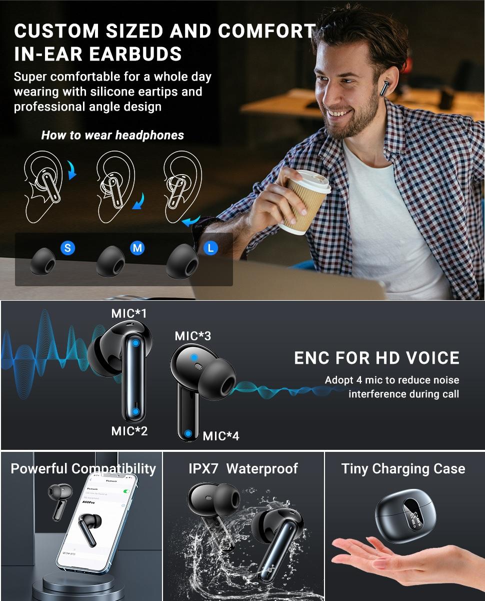 UTMÄRKT LJUDKVALITET: Bluetooth-hörlurarna använder 13 mm högtalare och en utmärkt Bluetooth-ljudcodec. Trådlösa hörlurar med brusreducering har 4 inbyggda högupplösta mikrofoner som förbättrar röster med 75% och ger 50% mer bas. Dessa högkvalitativa Bluetooth-hörlurar levererar överlägsen HI-FI-stereomusik. De säkerställer också högupplöst röstigenkänning och samtalskvalitet även i bullriga miljöer.