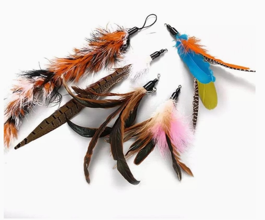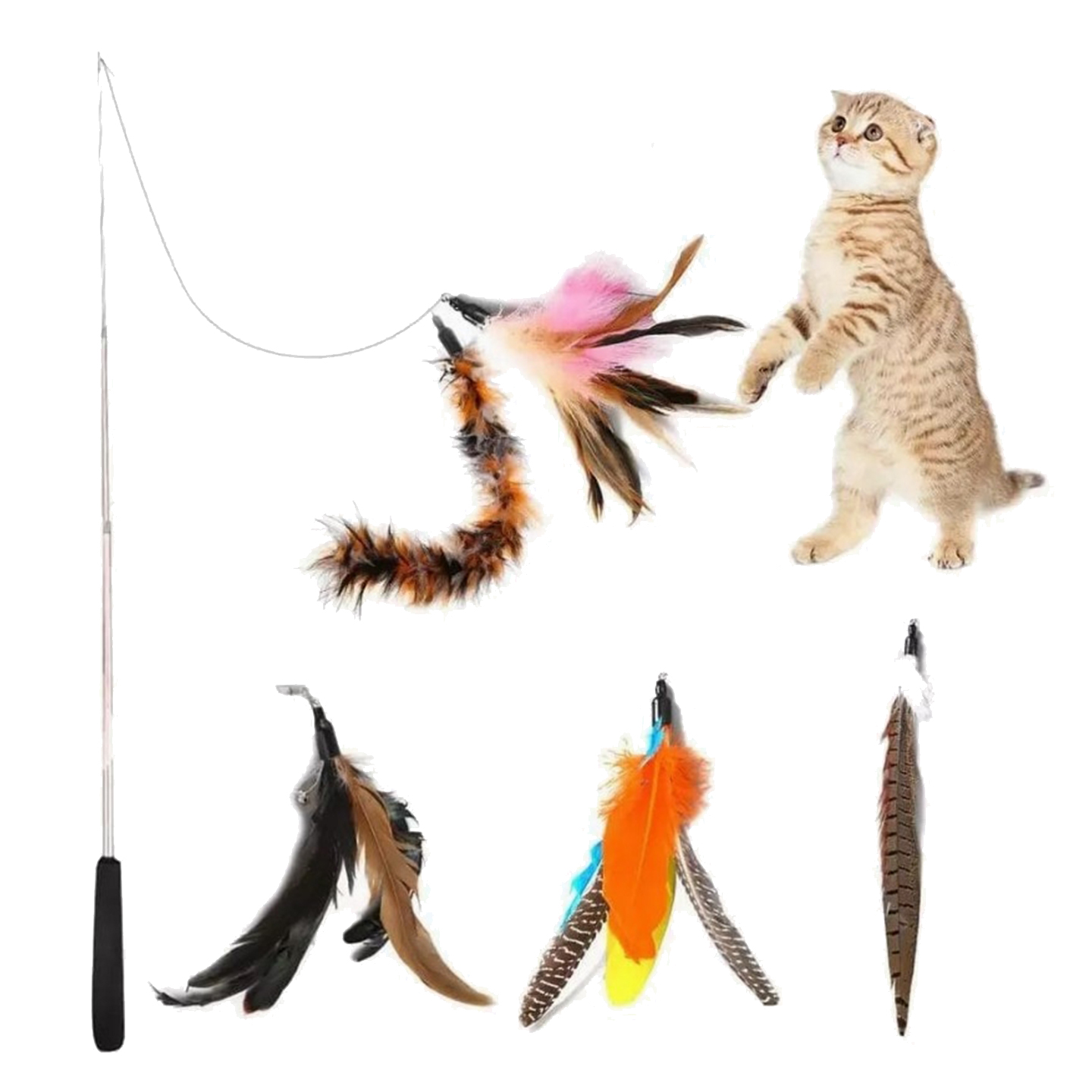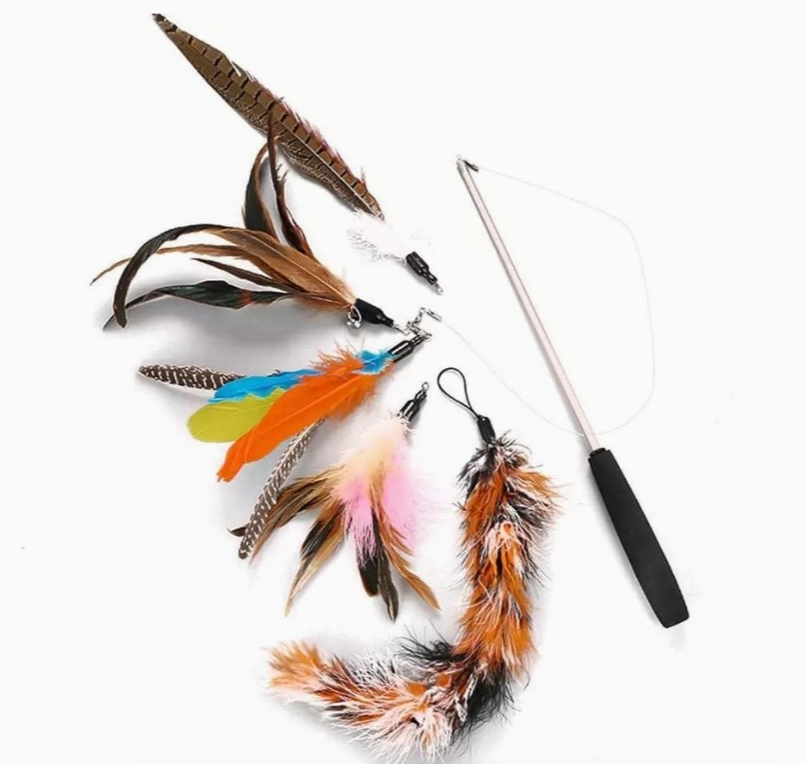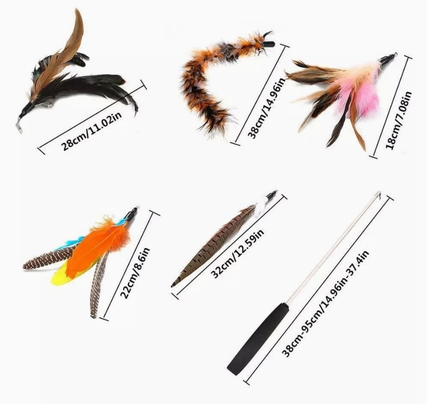 Detta paket innehåller ett teleskopiskt handtag och 5 utbytbara fjädrar som gör att din katt kan få den variation de älskar, hitta din favorit direkt. När din katt tröttnar på en variant är det bara att byta fjädrarna så blir leksaken så bra som ny.
