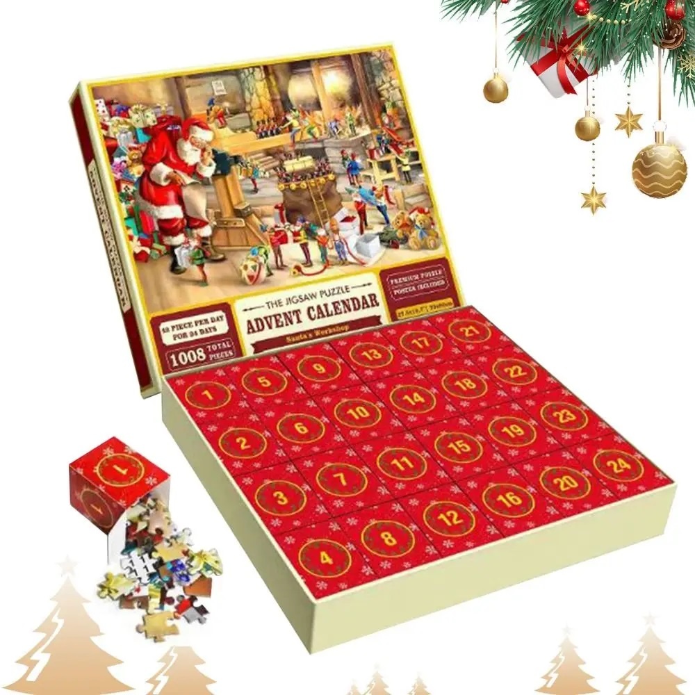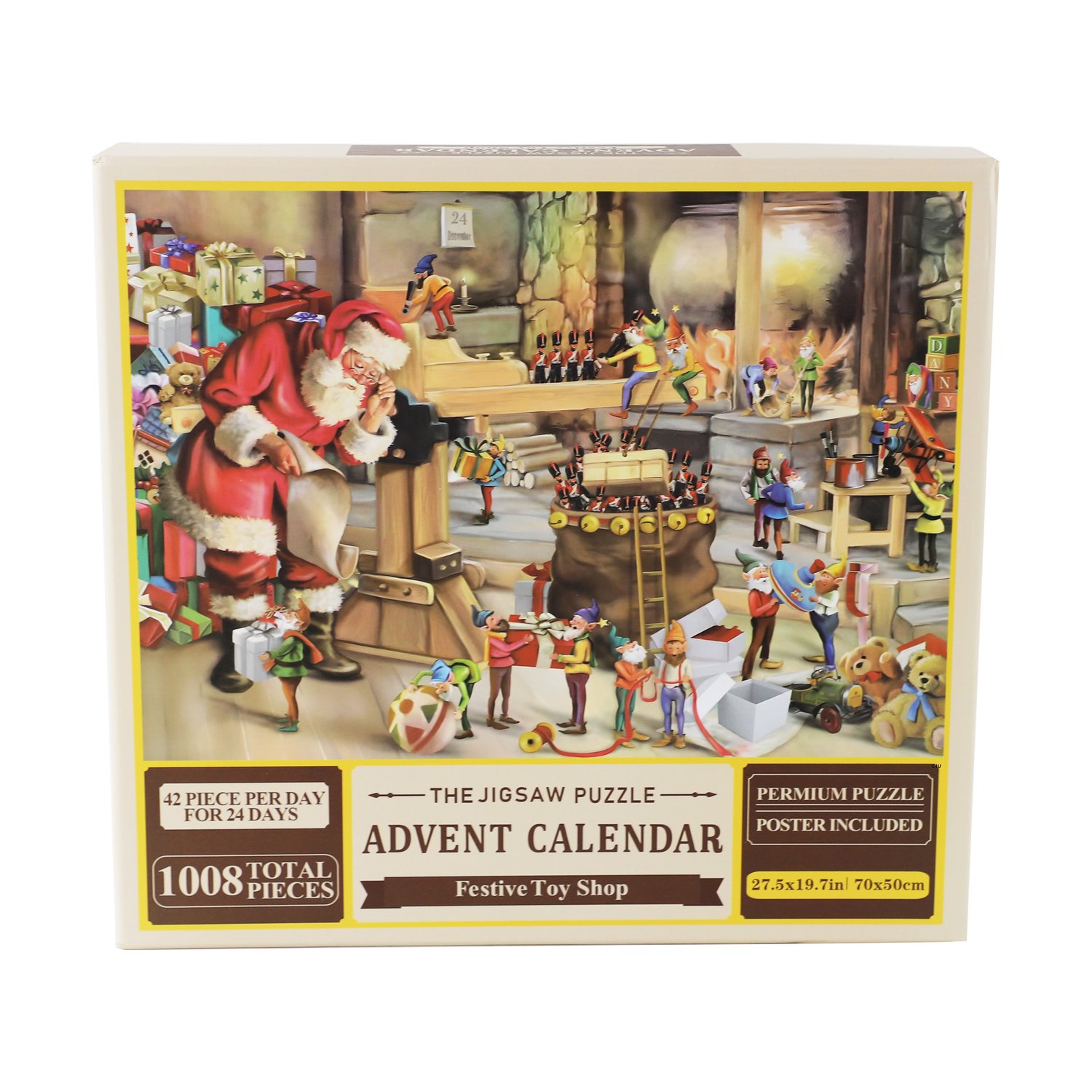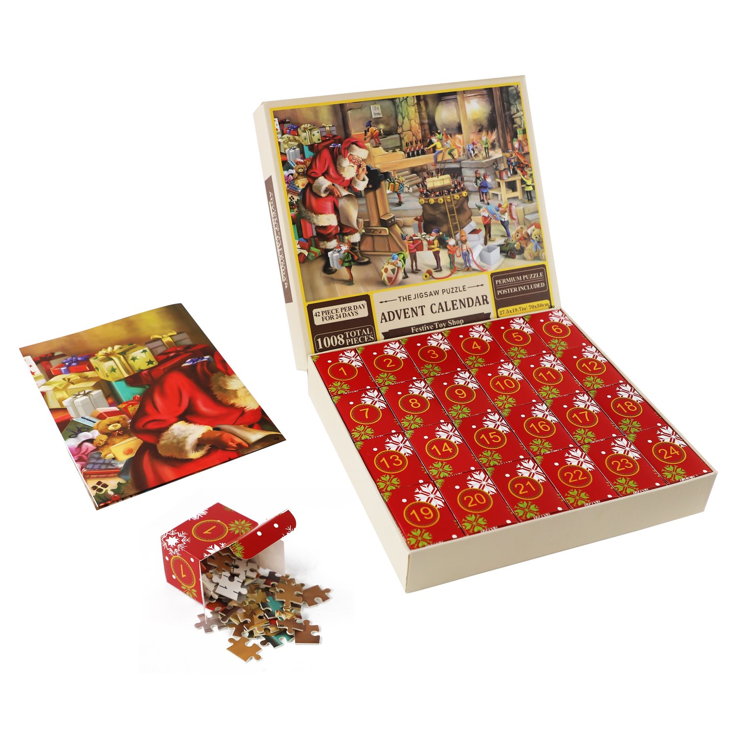 Paketet innehåller 24 numrerade lådor, där varje låda innehåller 42 högkvalitativa pusselbitar. När alla bitar är på plats har du ett fantastiskt pussel med totalt 1008 bitar som föreställer en charmig leksaksbutik, ett motiv som sprider julstämning och glädje. Pusslet mäter färdigt 70 x 50 cm, vilket gör det till en imponerande dekoration att njuta av långt efter att julen är över som tex en tavla på väggen.