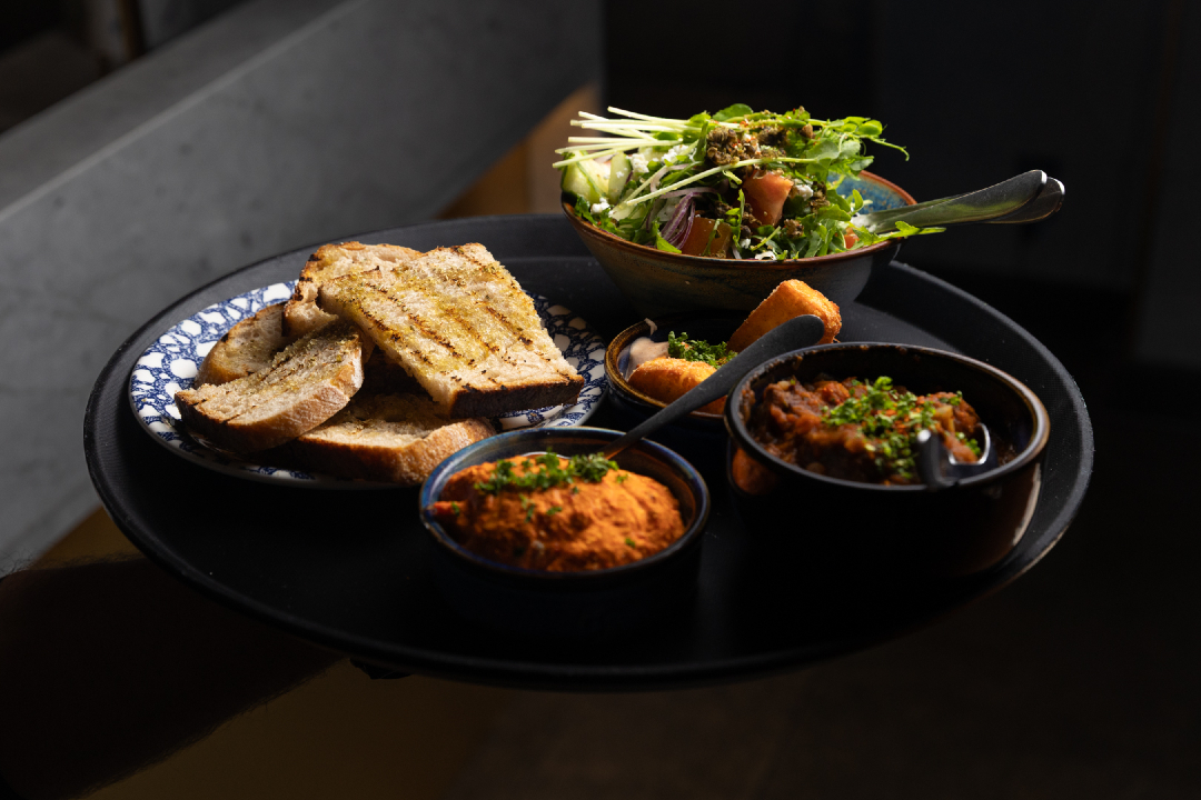 - Smakrikt meze-bord med klassiker som tzatziki, pitabröd, grillad halloumi och souvlaki