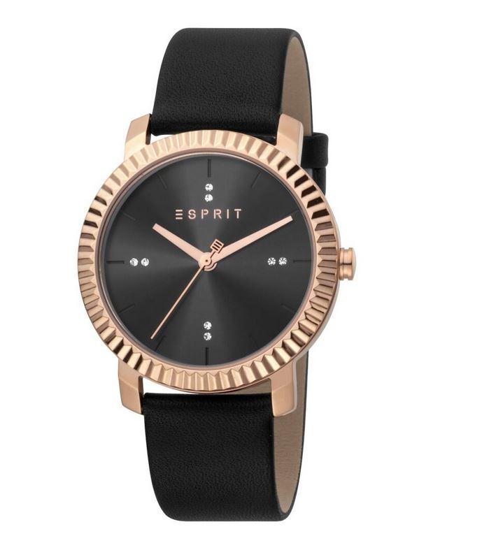En vacker damklocka från Esprit. Stilrent utförande med svart läderarmband, svart urtavla och roséfärgat bezel.