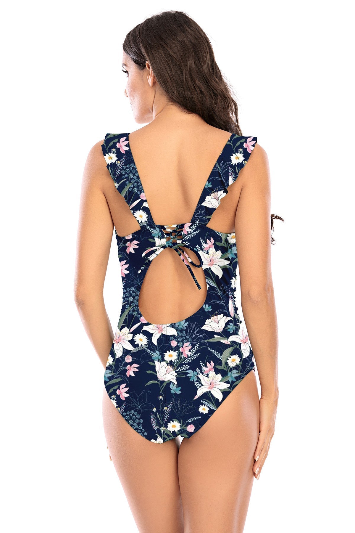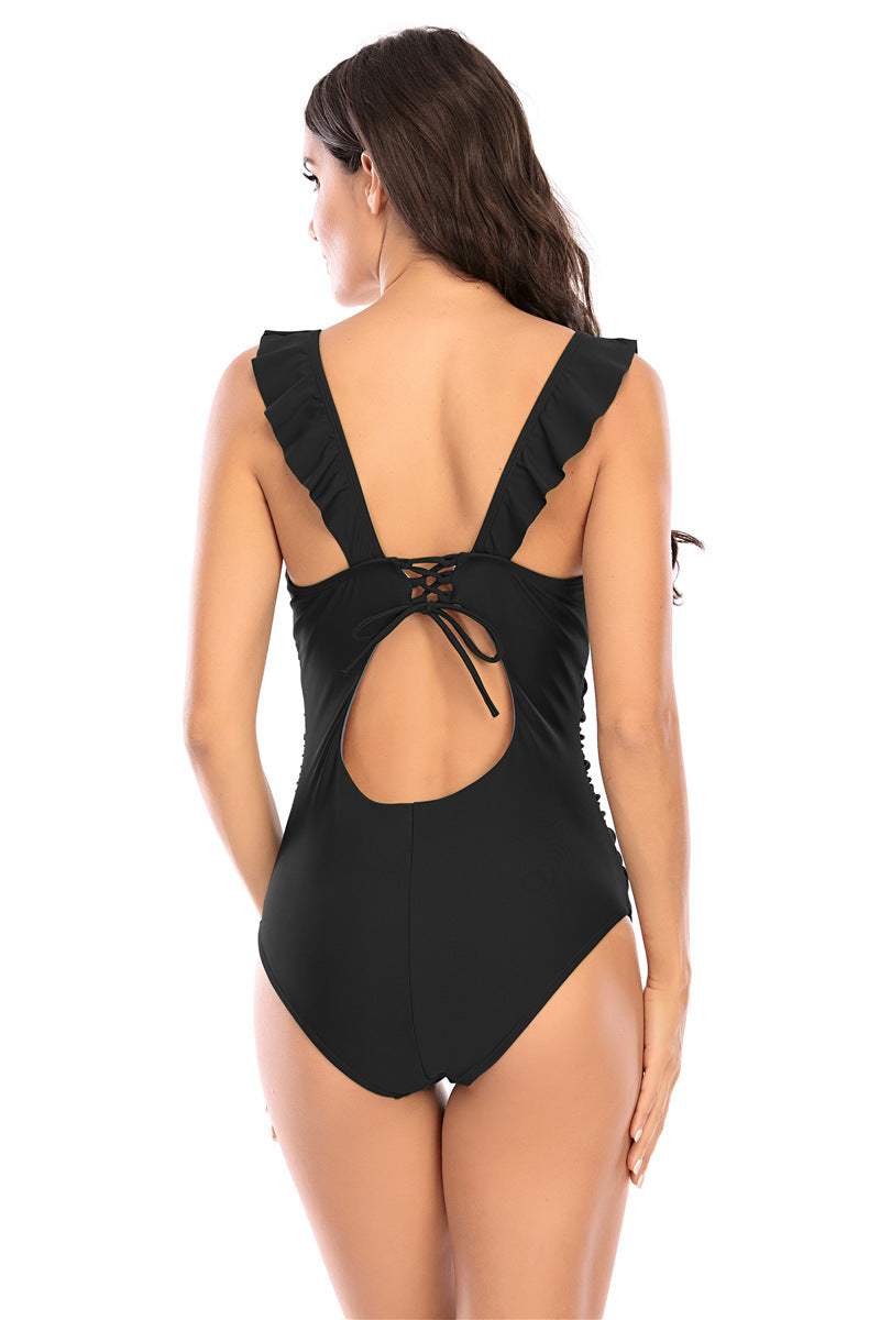 Baddräkt med v-ringning, volanger längs axelbanden och avtagbar vaddering. Välj mellan svart, blå, röd, gul, grön, leopard, blommor och prickar.