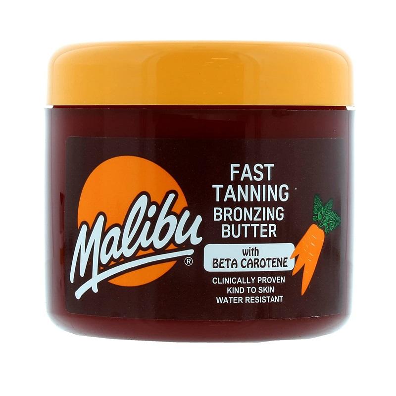 Malibu Fast Tanning Bronzing Butter med Betakaroten är ett kroppssmör som inte skyddar mot UV-strålar. Det är perfekt för människor med höga nivåer av melanin i huden som lätt får färg och som aldrig bränner sig. Denna produkt gör din hud slät och innehåller betakaroten och vitamin E. Den är vattentålig och har kliniskt visat sig vara snäll mot huden.