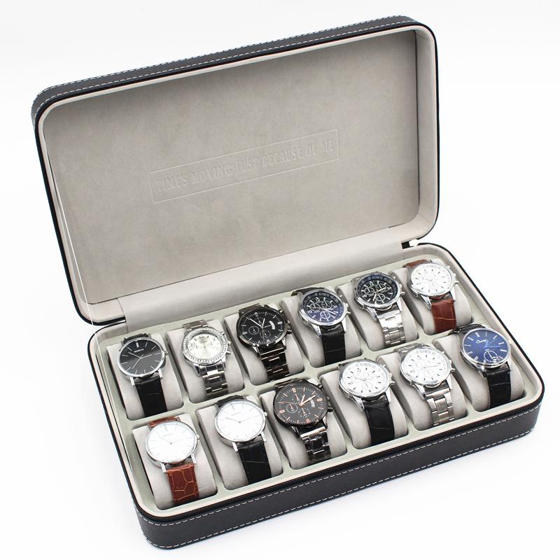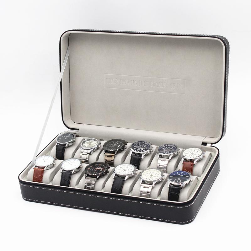 Tillverkad i svart PU läder med vit söm och grå insida. och med plats för 12 klockor. Boxen är försedd med dragkedja och är praktisk att ta med på resor.