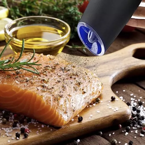 • LED-belysning: Blått ljus tänds automatiskt när du lutar kvarnen, vilket ger extra ljus vid kryddningen.