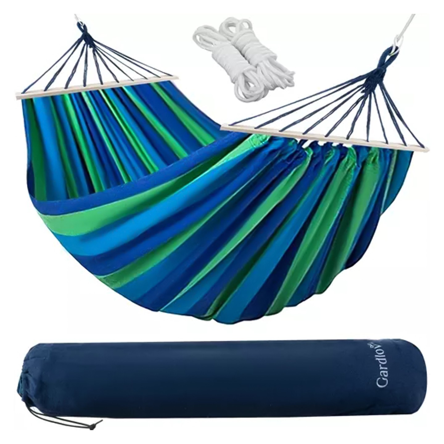 Koppla av tillsammans i Gardlovs rymliga hängmatta för två personer. Den är tillverkad i mjuk bomull med polyester för ökad hållbarhet och ventilering, vilket ger komfort även under varma sommardagar. De robusta trästängerna håller hängmattan utspänd som en säng, och den tjocka, flätade upphängningen gör vilan både stabil och trygg.