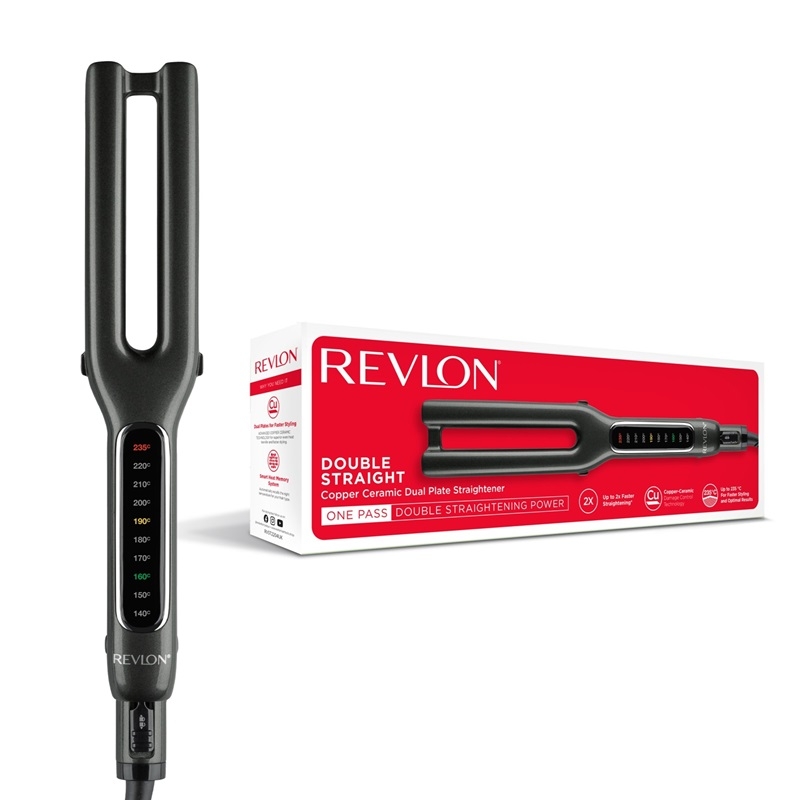 Revlon Double Straight är en revolutionerande plattång med en innovativ design. Dubbelplattan skapar dubbelt så stor rätningskraft under hårstyling, med ett enda