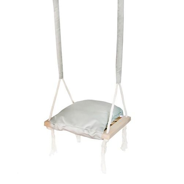 Tillverkad i ljust, slätt furu och mjukt Cleanaboo®-tyg, som står emot fukt och spill, vilket gör gungan extra lätt att hålla ren. Pompoms och plyschkudde ger extra komfort och charm i skandinavisk stil. Monteras enkelt med medföljande rep och metallringar – redo att skapa lek och glädje i många år framöver.
