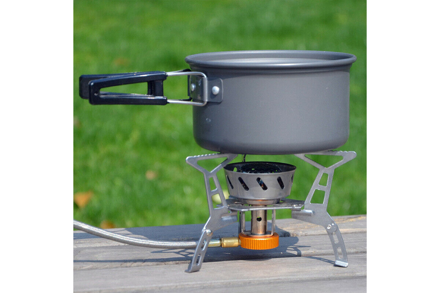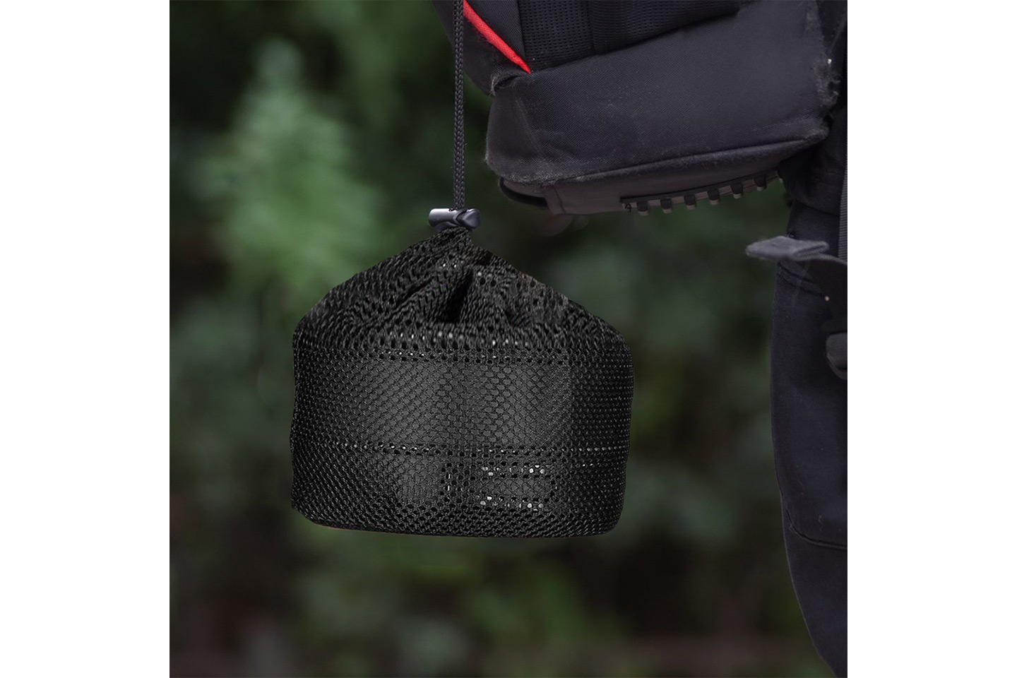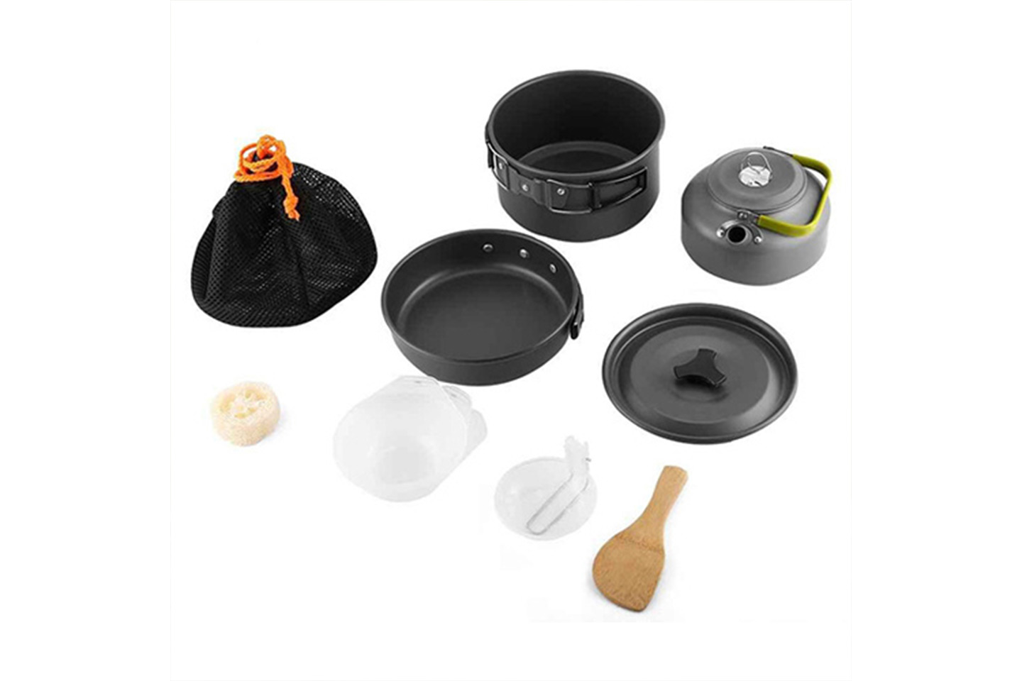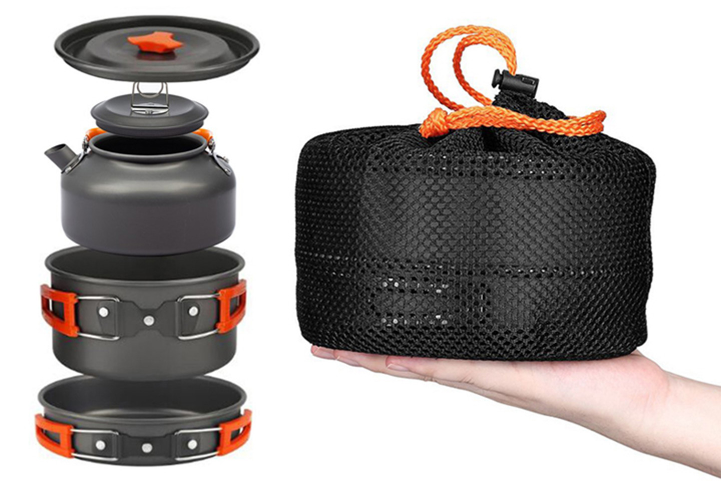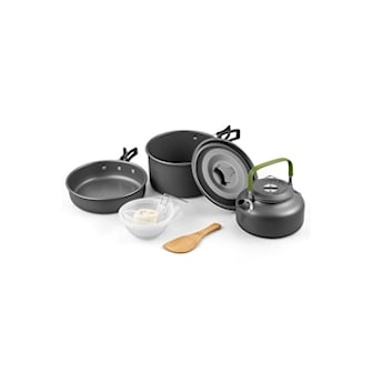 Laga mat när du är ute i naturen med detta fina stormkök utrustat med olika kastruller och stekpannor. Kitet är stapelbart och förvaras i medföljande nätpåse när det inte används.